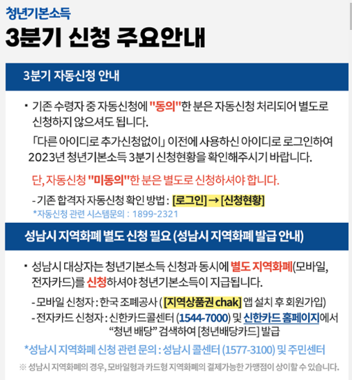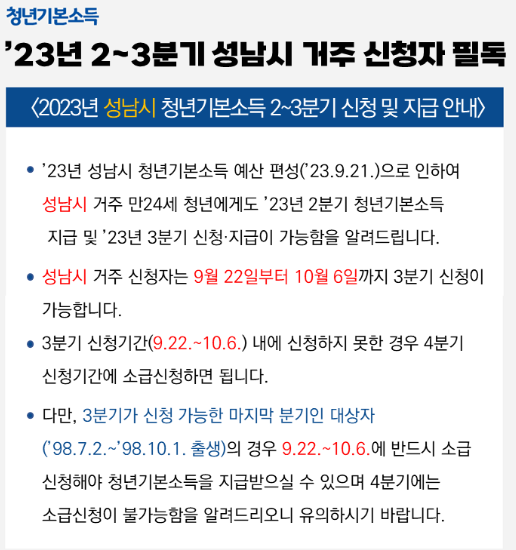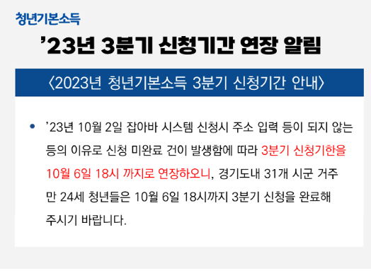 경기도에서 시행하는 청년정책의 경기도 청년기본소득은 행복추구, 삶의 질 향상, 건강 수준 향상 등 청년의 사회적 기본권 보장을 위하여 경기도와 시군이 협력하여 지급하는 정기적인 소득 지원금입니다. 3분기 신청이 기존 10월 2일에서 10월 6일까지 연장되었습니다. 아직 신청 못하신 분은 빠르게 신청하시어, 지원금 혜택을 꼭 받으시길 바랍니다.
