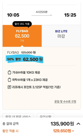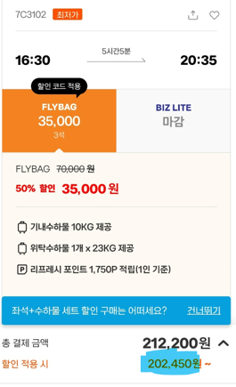 7. 출발과 도착 항공권 모두 'FLY BAG' 이나, 위탁수화물1개, 23KG & 기내수화물 10KG 제공이 됩니다.