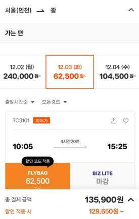 2. 카카오페이 '괌 왕복노선' 예매 시 추가 결제 혜택