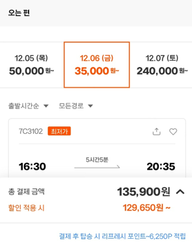 6. 도착일 12월 6일을 선택하니, 50% 할인된 운임 35,000원이 확인됩니다.