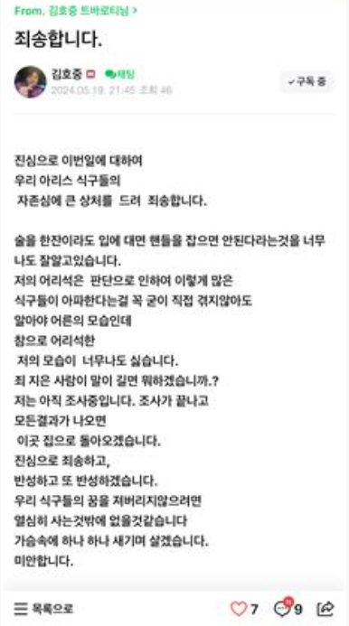 조직적으로 김호중의 음주운전을 은폐했다는 혐의를 받는 소속사 생각엔터테인먼트도 사과했습니다. 소속사는 "당사의 잘못된 판단으로 사회적 물의를 일으킨 점 고개 숙여 사과드린다"면서 "최초 공식 입장에서부터 지금까지 상황을 숨기기에 급급했다. 가수를 보호해야 한다는 잘못된 생각으로 되돌릴 수 없는 잘못을 저질렀다"라고 전했습니다.
