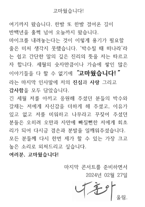 끝으로 “모든 분들께 다시 한 번 제가 할 수 있는 가장 크고 높은 소리로 외쳐드리고 싶다. 여러분 고마웠습니다”라며 “마지막 콘서트를 준비하면서. 2024년 02월 27일 나훈아 올림”이라고 편지를 마무리했습니다.