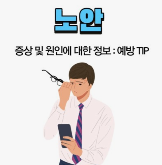 노안(안구 나이로 인한 시력 저하)은 노화로 인해 안구의 조절능력이 약화되어 발생하는 시력 감소 현상입니다. 노안은 주로 안구의 수정체인 수정체의 유연성이 저하되고 근육 조절 능력이 약해지는 노화로 인해 발생합니다. 이로 인해 먼 거리의 물체를 보거나 가까운 거리에서 작은 글자를 읽는 데 어려움을 겪게 됩니다.