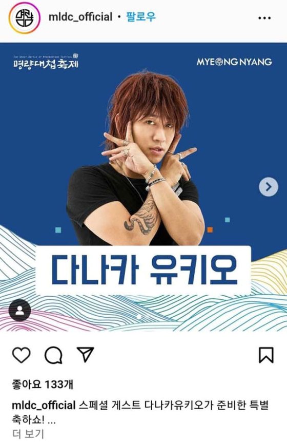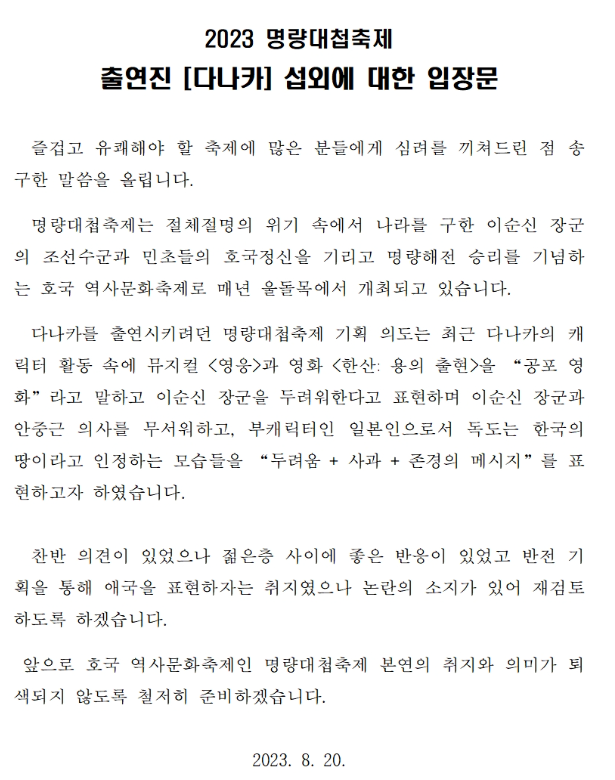 이러한 소식이 알려지자 축제 인스타그램 계정 등에는 비판글이 쏟아졌고, 다나카가 일본 유흥업소 남성 종사자를 콘셉트로 하고 있기 때문에 명량대첩축제 게스트로는 적절하지 않다는 의견이 많았습니다. 축제추위원회에서 관련 해명을 다나카 캐릭터 활동 속에 ▶뮤지컬 '영웅'과 영화 '한산: 용의 출현'을 공포 영화라고 말한 점 ▶이순신 장군을 두려워한다고 표현하며, 이순신 장군과 안중근 의사를 무서워한 점 ▶부캐릭터인 일본인으로서 독도는 한국의 땅이라고 인정한 점 등을 언급하며 '두려움+사과+존경의 메시지'를 표현하고자 했다고 해명했습니다.