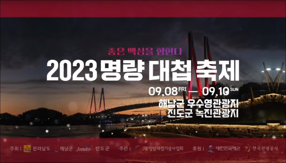 명량대첩축제 행사에 앞서 특정 연예인의 섭외 논란의 이슈가 있었지만, 이순신 장군과 전라도민의 호국정신 선양사업의 하나로 전남도와 해남군, 진도군의 공동 주최로 울돌목 일원에서 매년 개최되고 있는 축제로써, 매년 다양하고 스케일인 큰 무대와 각종 즐길거리가 풍성한 축제입니다. 가을의 문턱에 접한 명량대첩축제를 뜻깊게 즐기시면 좋겠습니다.