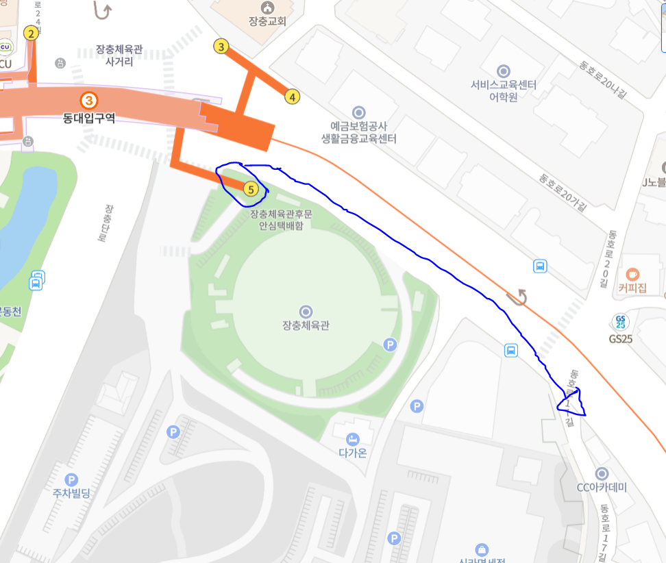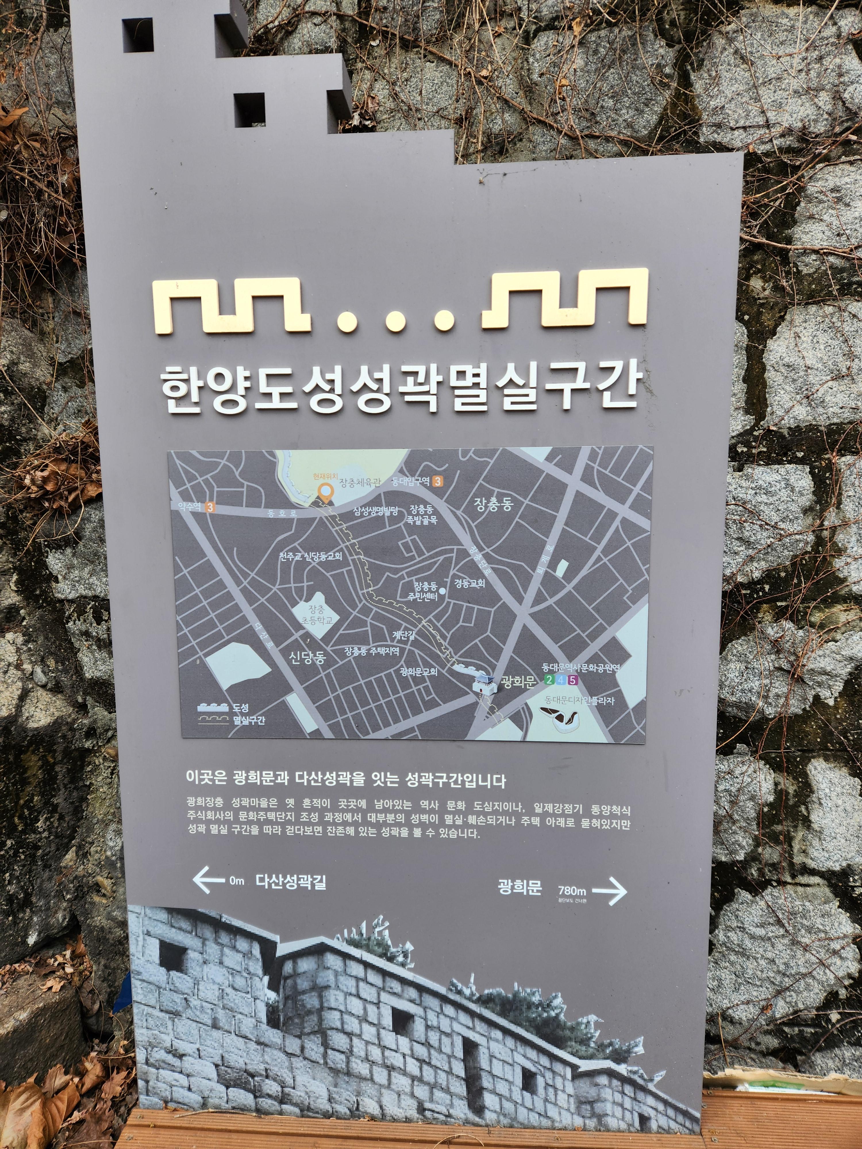 지하철 3호선 동대입구 5번 출구로 나와 100m쯤 걷다보면 장충체육관을 끼고 신라호텔 면세점 뒤편으로 난 데크 계단길이 한양도성 남산구간 다산성곽길 진입로입니다.