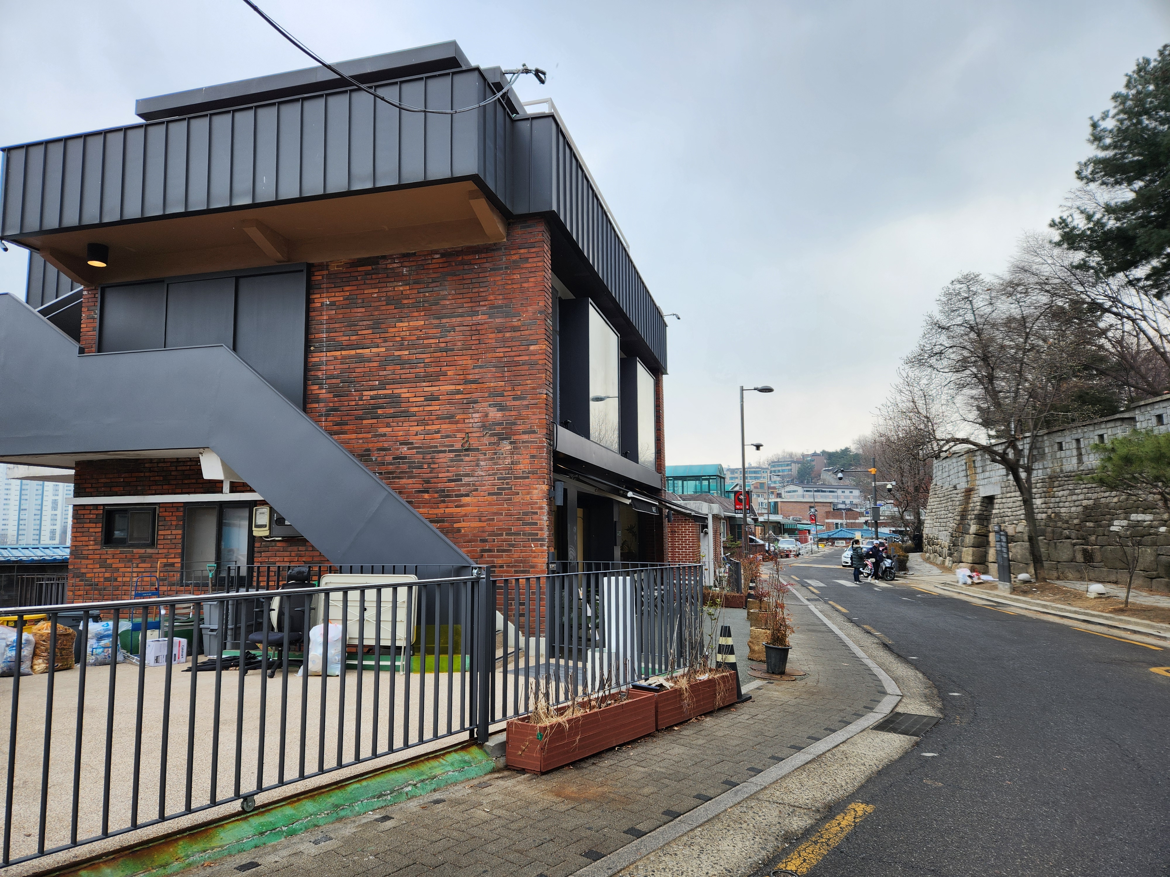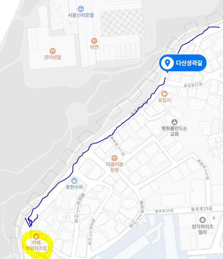 한양도성 다산성곽길 진입로에서 대략 15분 정도 걷다 보면, "의외의 조합"이라는 카페 건물을 만나게 됩니다. 지금처럼 카페 건물을 작년 드라마 촬영당시 박신혜의 집으로 부산원조밀면집으로 개조를 해서 촬영을 했었다고 합니다.