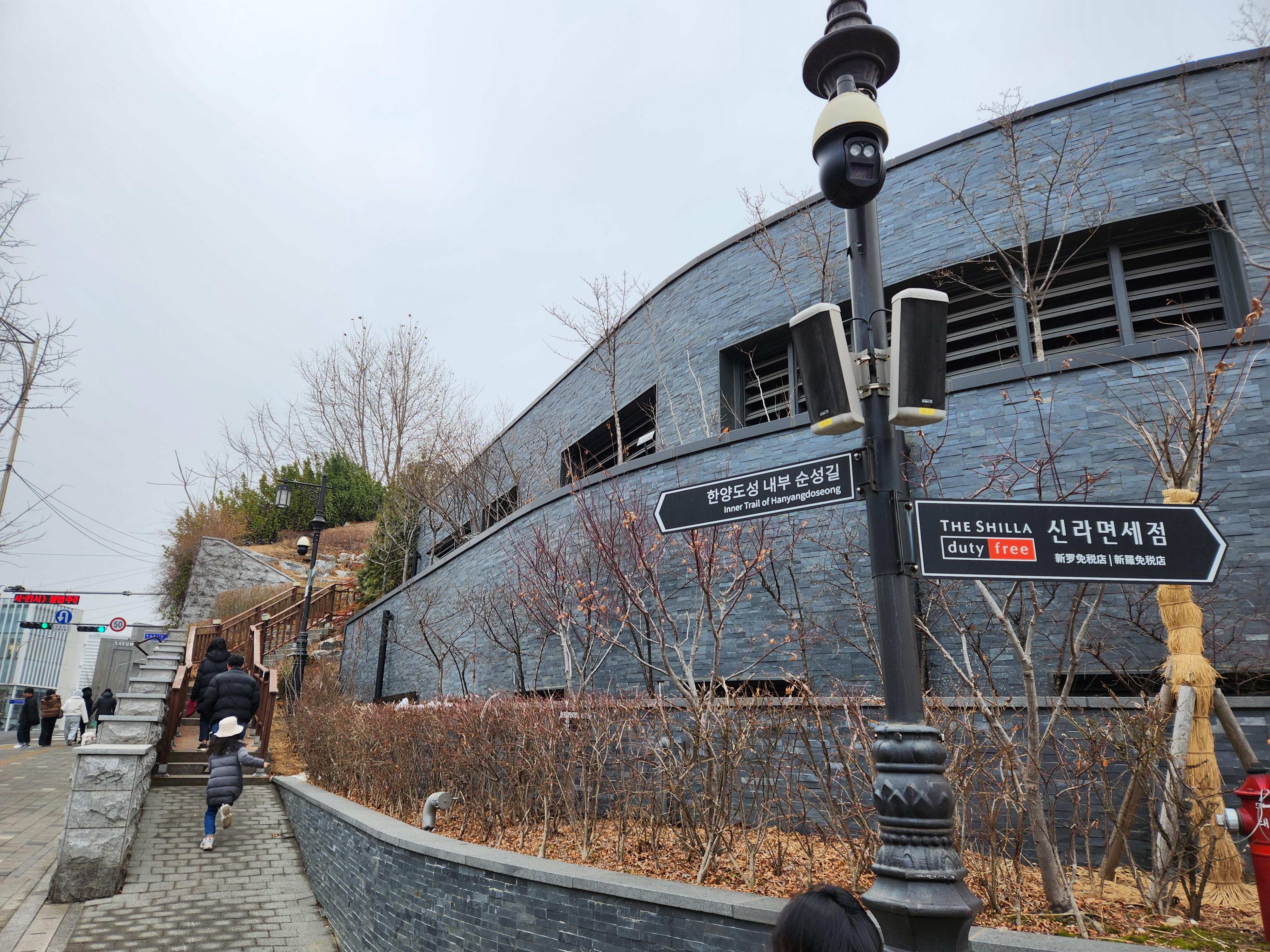지하철 3호선 동대입구 5번 출구로 나와 100m쯤 걷다보면 장충체육관을 끼고 신라호텔 면세점 뒤편으로 난 데크 계단길이 한양도성 남산구간 다산성곽길 진입로입니다.