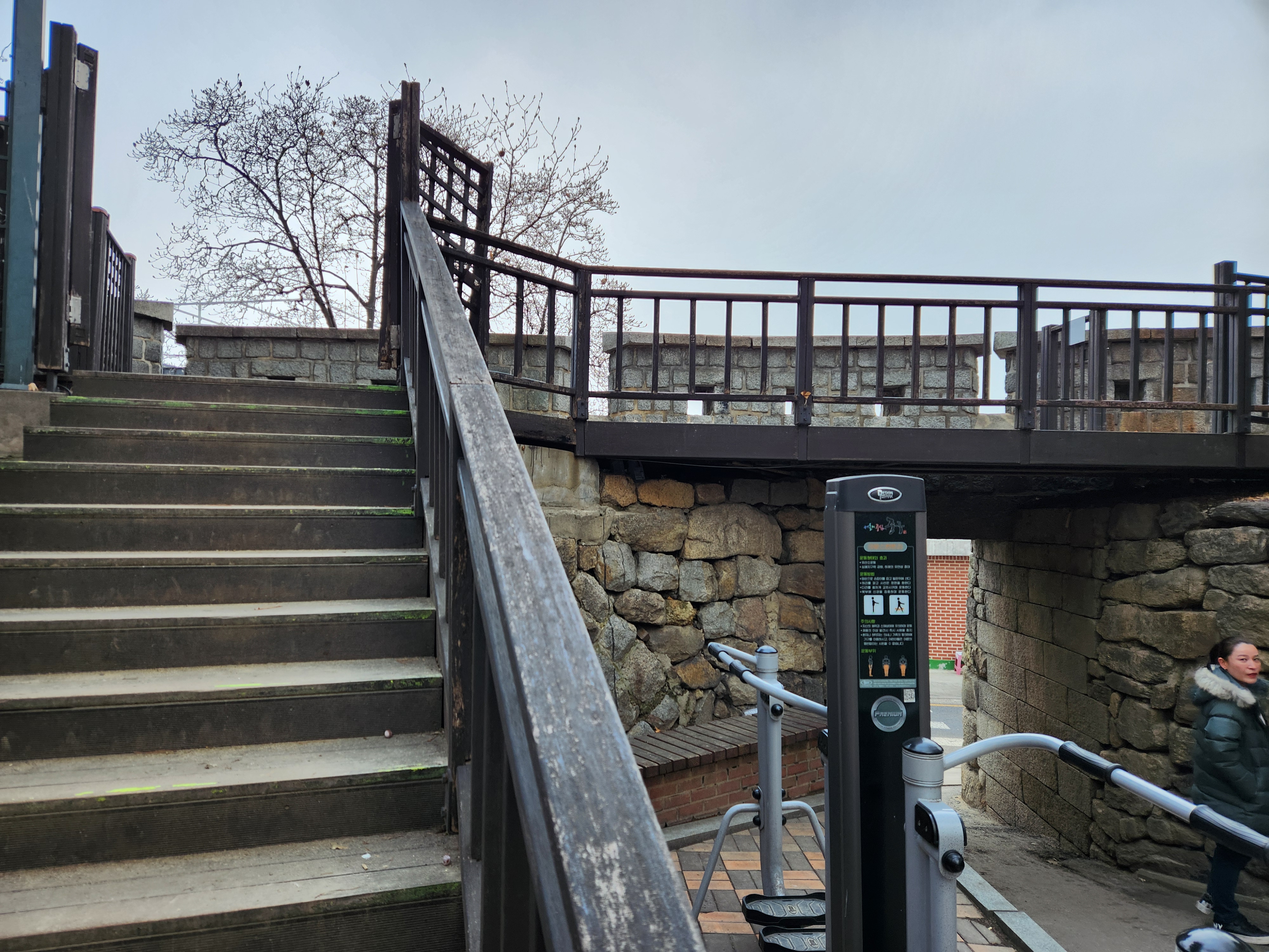 그리고 바로 위쪽에 주연배우들이 집 앞에서 대화를 나누는 신에서 자주 보였던 성곽 암문이 나오며, 암문을 통과하면 운동기구와 성곽 상단과 연결된 계단으로 성곽 윗길을 걸을 수 있게 됩니다.