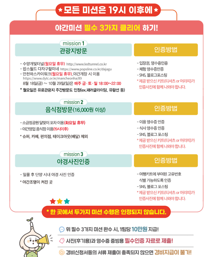 3명 이상 팀을 구성해 오후 7시 이후에 지정된 관광지와 음식점을 방문하고 야경 사진을 인증하면 여행경비 보조금 명목으로 1팀당 10만원을 여행경비 지원으로 지급한다고 합니다. 예산 소진시 조기 마감될 수 있으니, 빠르게 신청하시기 바랍니다.