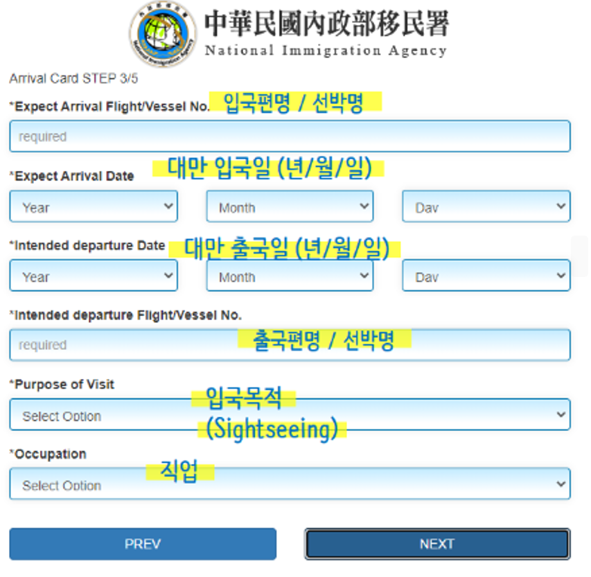 4) 여행정보, 항공정보 입력 ( 항공편, 입출국날짜, 직업 선택 등 )