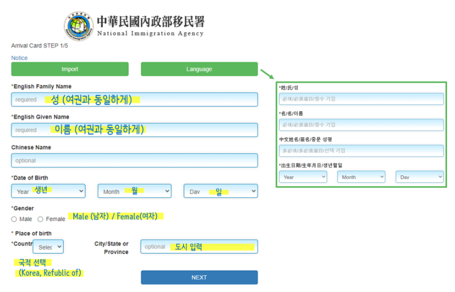 1) 대만 이민청 입국신고서 작성 사이트 접속을 합니다.(상기 바로가기 버튼을 누르면 바로 접속이 됩니다.)
