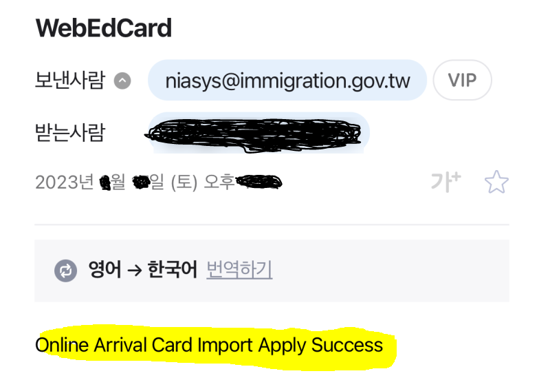 CONFIRM 버튼을 누르면 작성이 완료됩니다. 이후에는 입력했던 메일로 온라인 입국신고서 제출이 성공했다는 메일이 오고 이것으로 끝입니다. 이후에는 대만에 도착해서 입국을 하시면 됩니다.