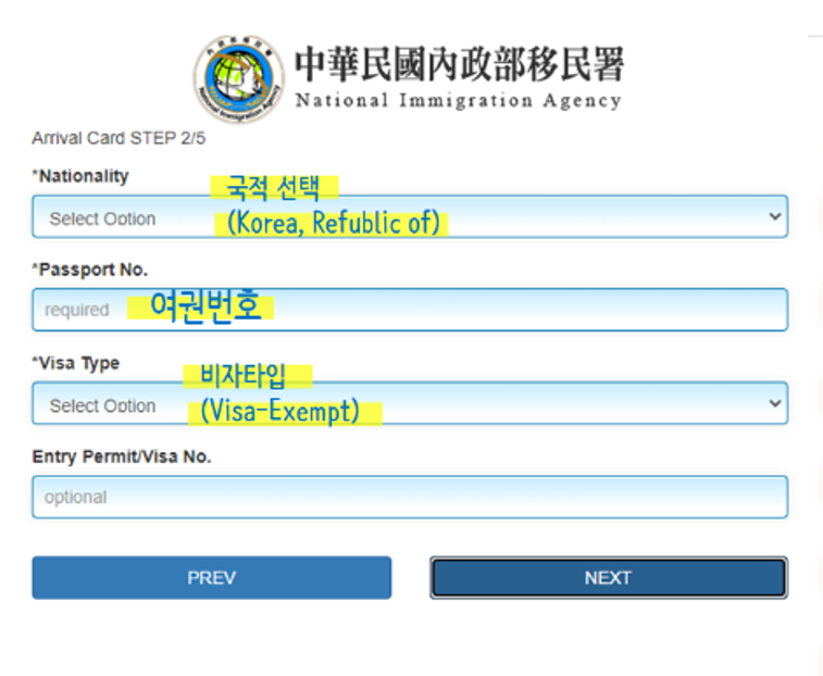 3) 개인정보 입력 2 ( 국적, 여권번호, 비자타입 선택 등 )
