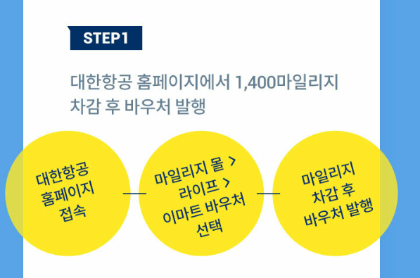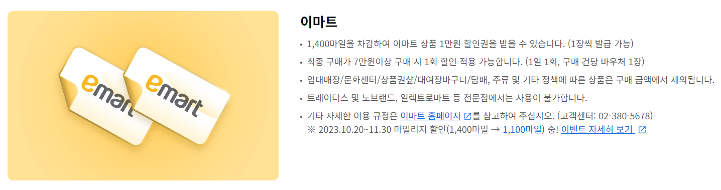 이마트에서 7만 원 이상 결제 시 1,400마일 차감 후, 1만원 할인(바우처사용 / 1일1회 한정)