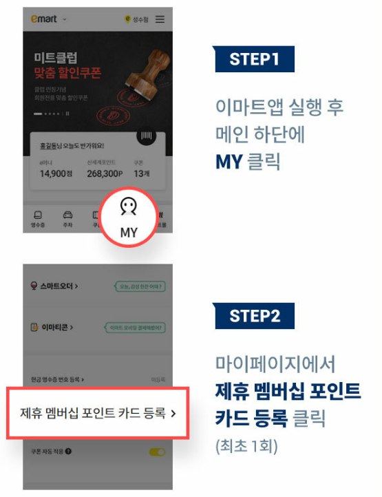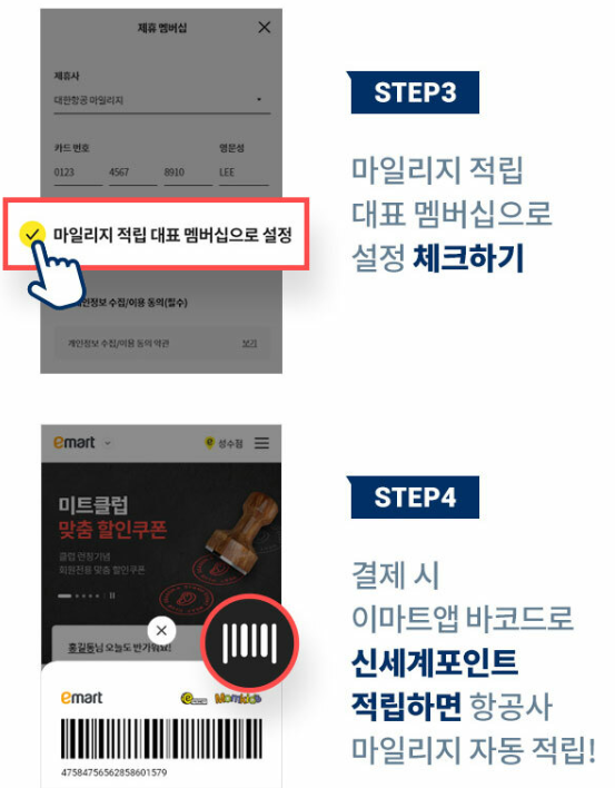 이마트앱 실행 후 메인 하단 MY 접속하여 제휴 멤버십 포인트 카드 등록을 클릭 후 마일리지 적립대표 멤버십으로 설정을 체크합니다. 이마트에서 상품 구매 결제 시 이마트앱 바코드로 신세계포인트를 적립하면 대한항공 마일리지로 자동적립이 됩니다.