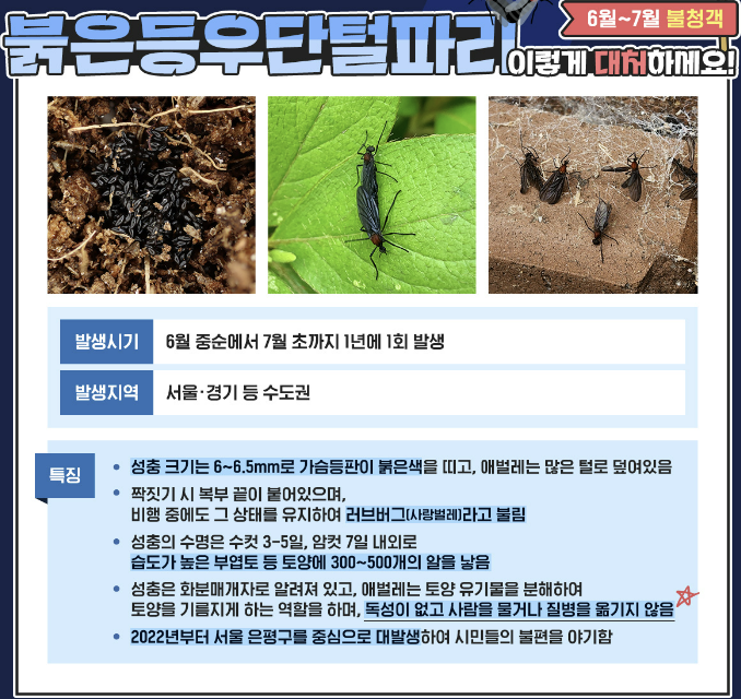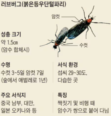 러브버그는 붉은등우단털파리 입니다. 러브버그는 항상 암수 쌍으로 다니는 것이 특징이며, 사람을 물지는 않고 독성도 없지만 보기에 좋지 않고 생활 속에서 불편함을 느끼게 하기 때문에 문제가 되고 있습니다.
