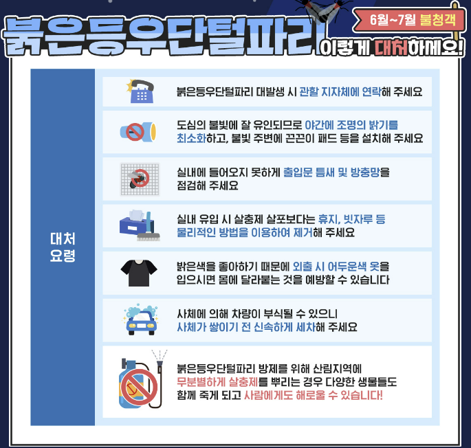 - 어두운 옷 착용: 러브버그는 밝은 색을 좋아하므로, 외출 시 어두운 색의 옷을 입는 것이 좋습니다.