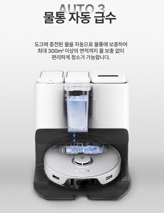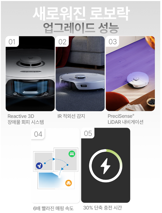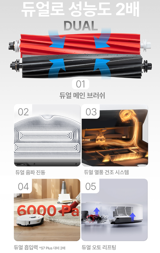 실리콘 소재의 나선형 브러쉬브러시 2개를 동시에 탑재되었습니다. 흡입 청소를 시작하면 이 듀얼 브러시가 서로 반대 방향으로 맞물려 돌아가면서, 머리카락 엉킴 없이 원목, 타일, 카펫 등 어떤 소재의 바닥도 더 효과적으로 청소해 줍니다. 여기에 흡입력도 기존 5,000Pa에서 6,000Pa로 개선되어 동급 제품들 중 최고 수준의 흡입력을 자랑합니다.