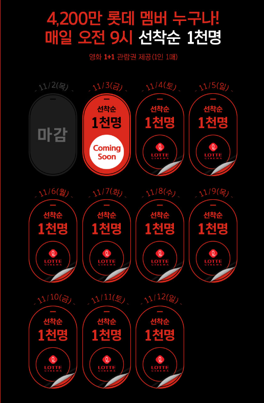 1) 영화 관람권 1+1 제공 : 매일 오전 9시 선착순 1000명 제공 (1인 1매 한정)
