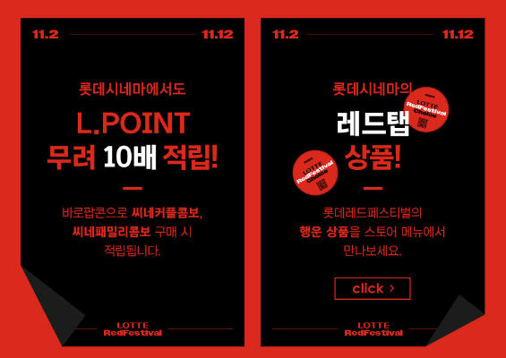 롯데그룹 유통 계열사의 통합 쇼핑 행사 ‘롯데레드페스티벌’은 롯데 11개 계열사가 함께하는 쇼핑 축제이며, 11월 2일부터 11월 12일까지 11일간 다양한 상품과 할인 그리고 이벤트까지 최상의 쇼핑기회입니다. 롯데시네마에서는 매일 오전에
