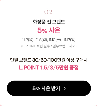 롯데백화점에서는 ‘슈퍼 뷰티 위크(11/2~11/12)’ 중 홀리데이 한정판을 포함해 총 130여 개 브랜드에서 화장품을 구매하면, 선착순으로 제공되는 최대 20% 금액 할인 쿠폰 혜택 외에도 매 주말(11/2~5, 11/10~12) 구매금액의 5% 상당을 엘포인트(L.POINT)로 적립해 주는 프로모션과 9일까지 ‘입생로랑 엉크르 드 뽀 쿠션’, ‘키엘 울트라 훼이셜 수분크림’ 등 베스트 상품을 구매하면, 선착순으로 구매금액의 최대 20%를 엘포인트로 증정하는 프로모션도 진행한다고 하니, 이번 슈퍼 뷰티 위크에 높은 할인과 구매 혜택 등으로 득템의 기회를 놓치지 않으시길 바랍니다.