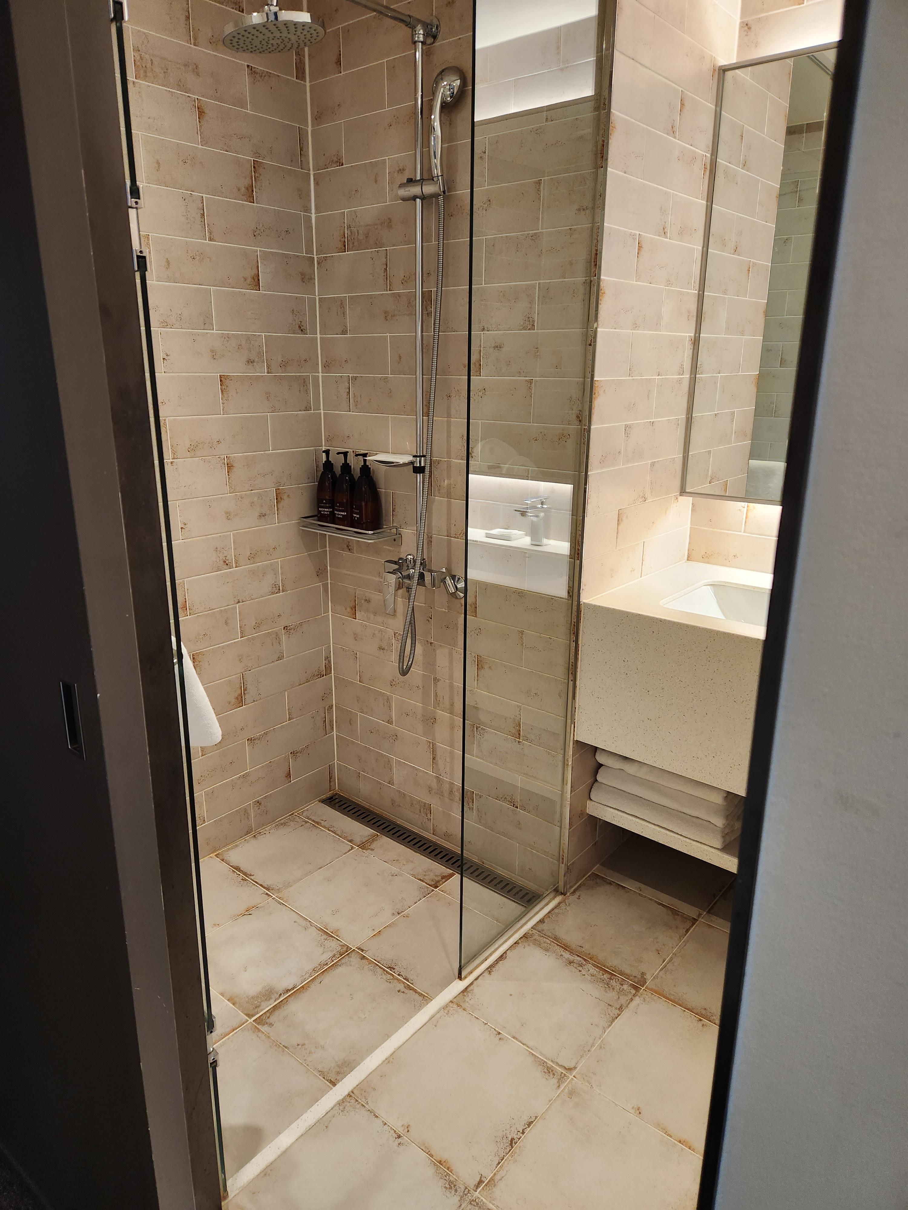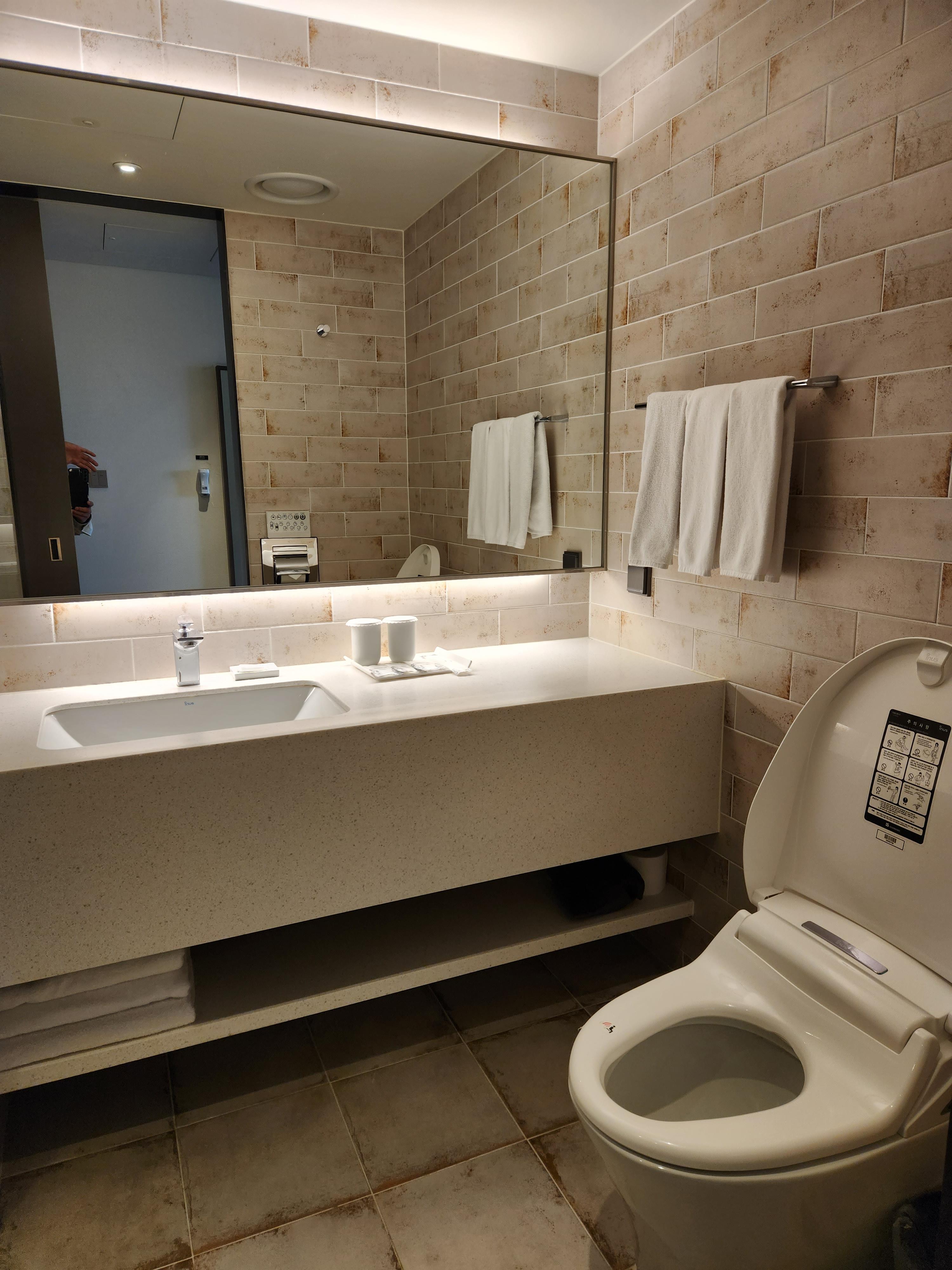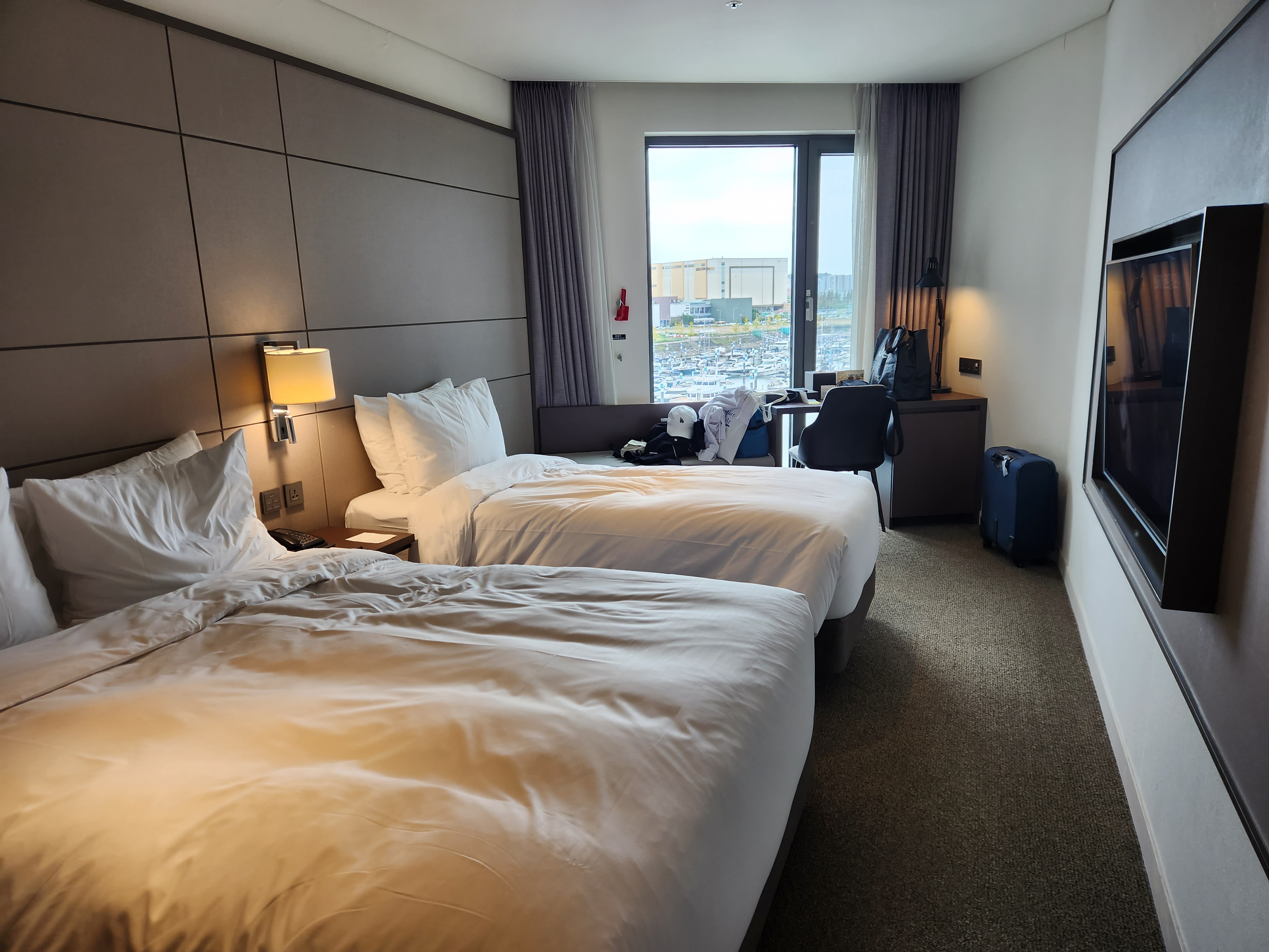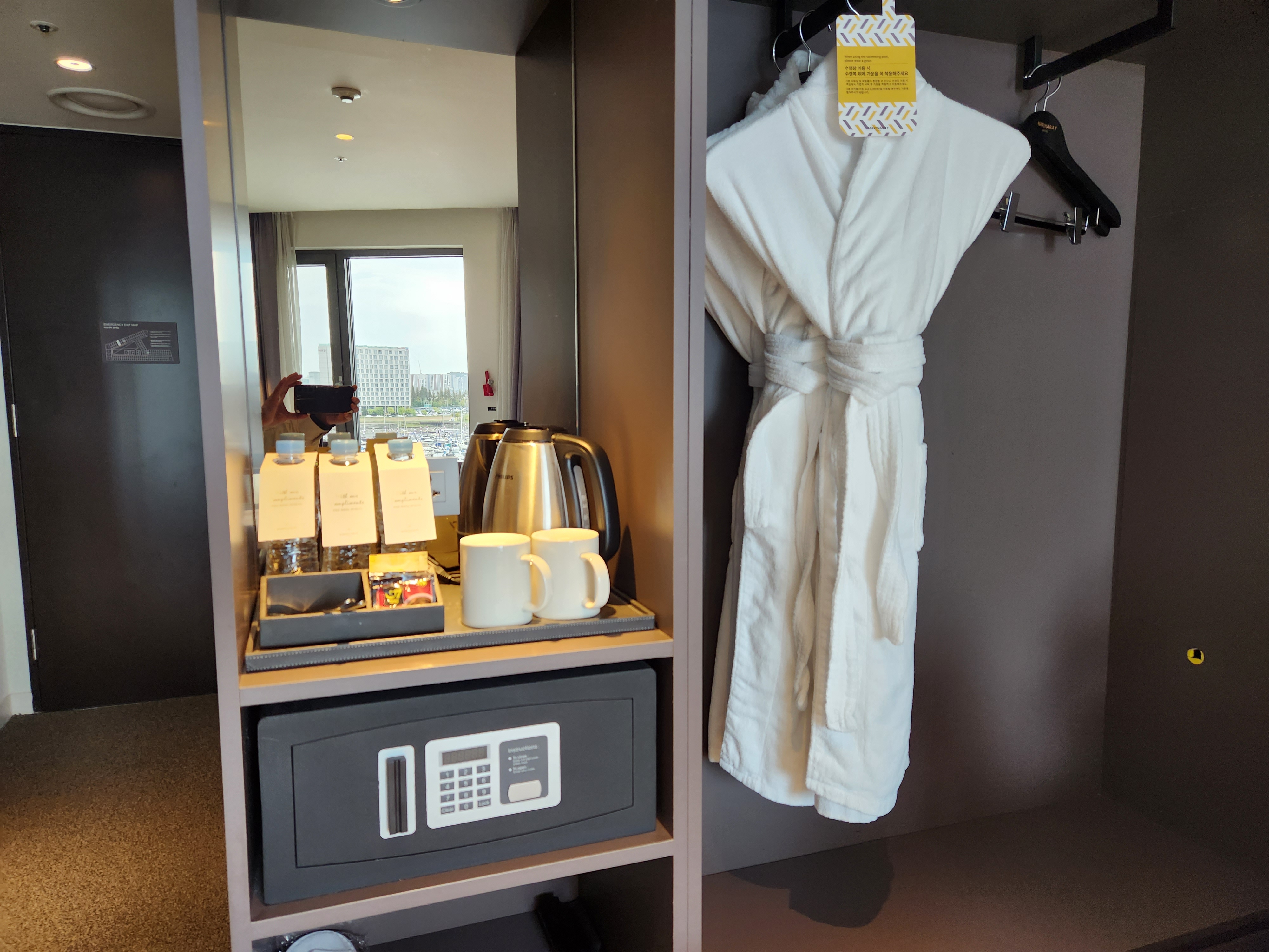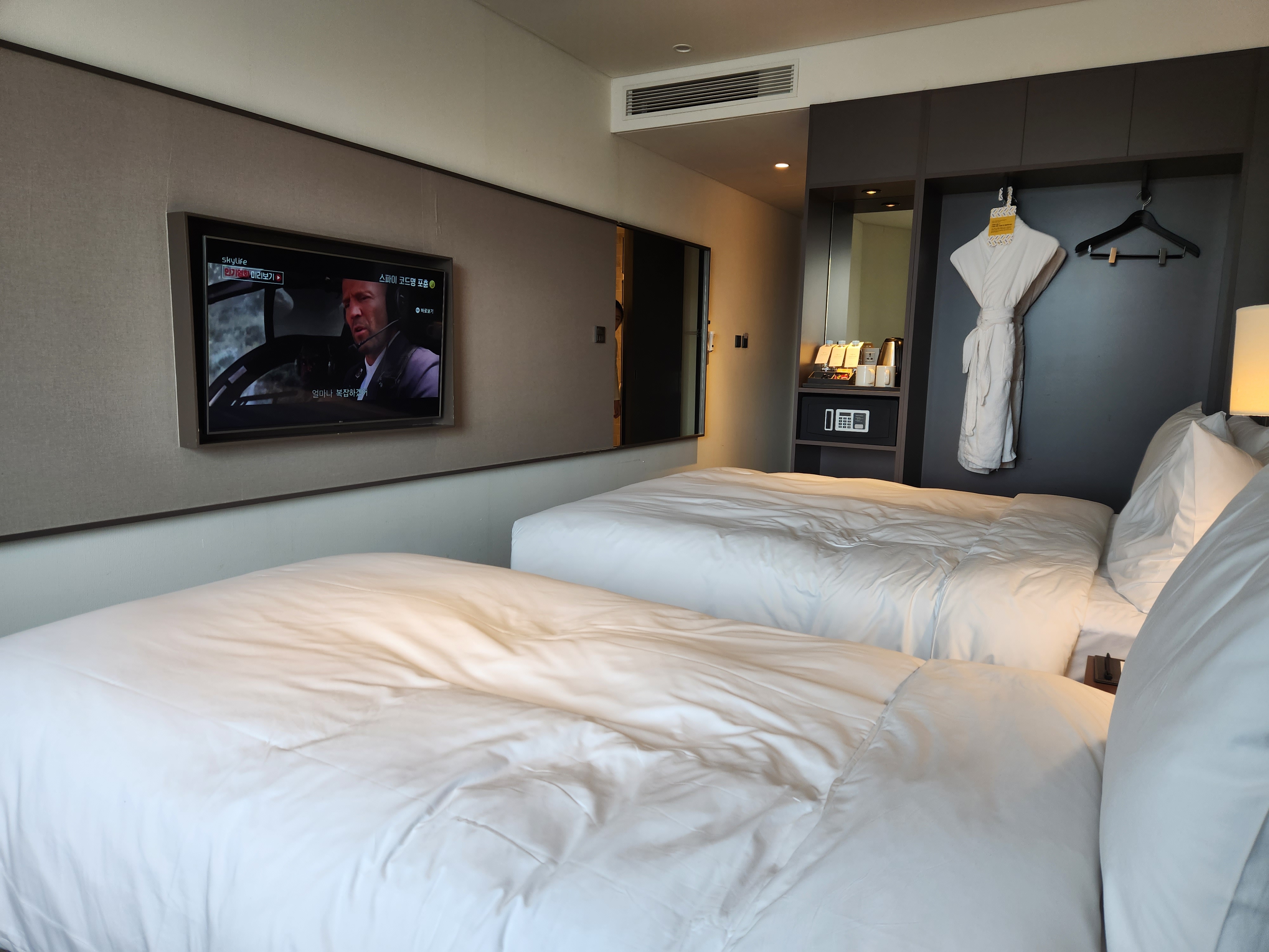 객실은 7층에 위치한 디럭스 패밀리 트윈객실로 침대는 더블베드 1 & 싱글베드 1이었고, 뷰는 아라뱃길 요트장과 김포현대아웃렛이 보이는 리버뷰였습니다. 객실은 5성 호텔의 디럭스 룸보다는 약간 좁아 보였고, 침대 밑과 정면 벽면 TV사이의 공간이 협조한 편입니다. 하지만, 공간활용을 잘하여, 창가 쪽에 책상과 바로 옆에 소파가 연결되어 콤팩트한 느낌으로 효율성을 높였습니다. 욕실에는 욕조는 없지만, 샤워부스의 공간도 넓고, 세면대와 변기 등 욕실 시설물들은 양호하며, 비데 리모컨 작동 및 수온과 수압 등 전체적으로 만족하였습니다.