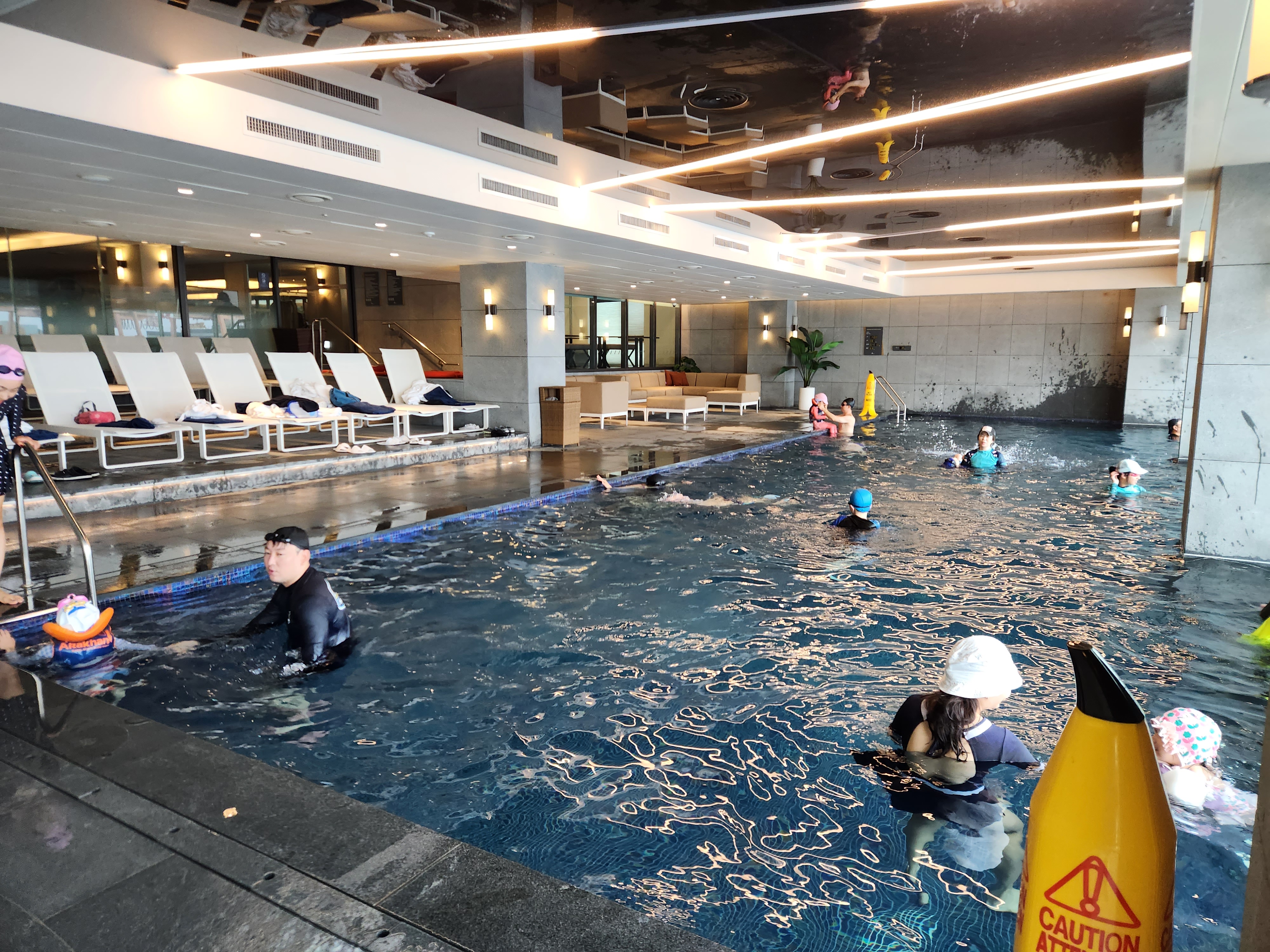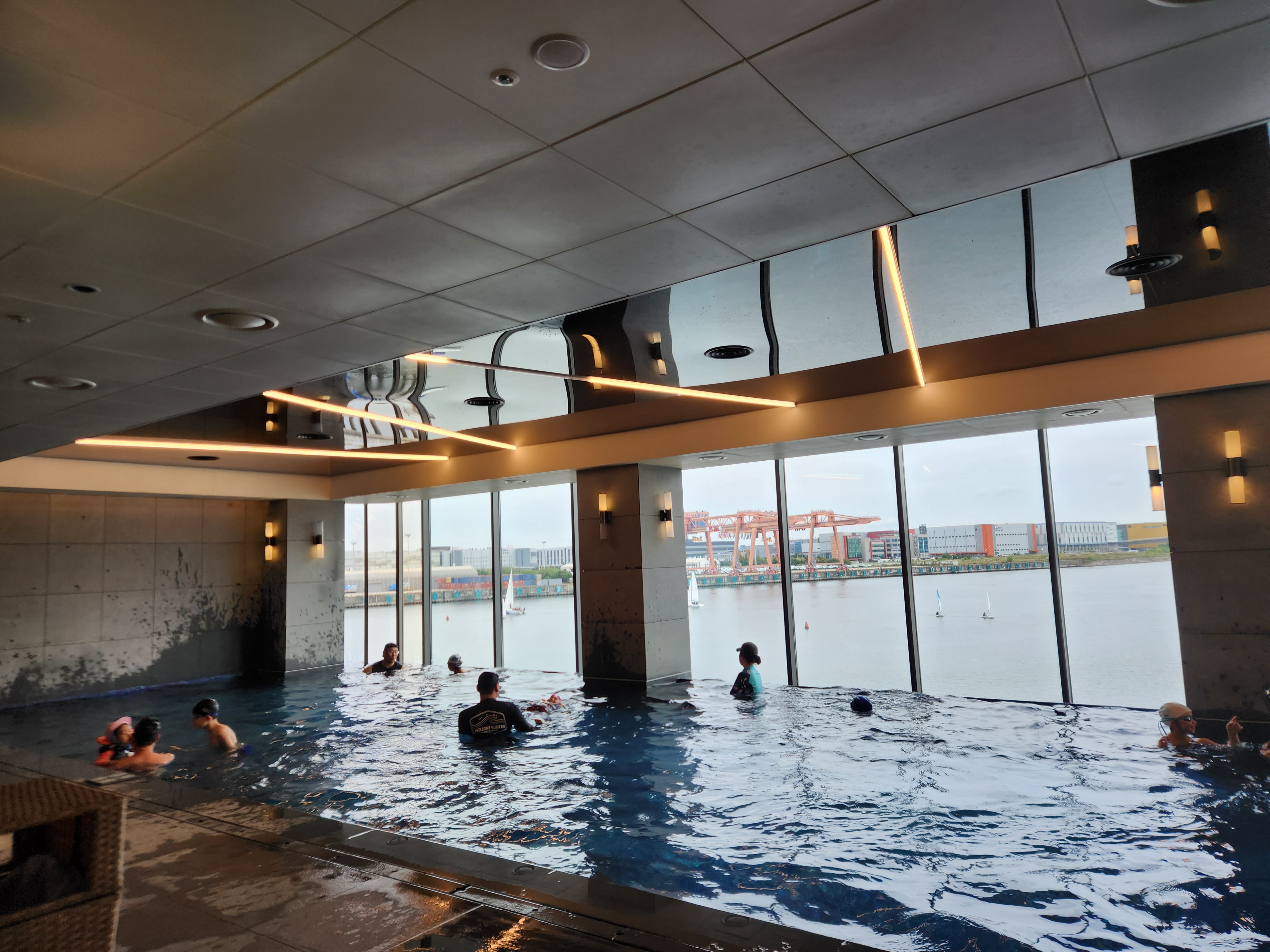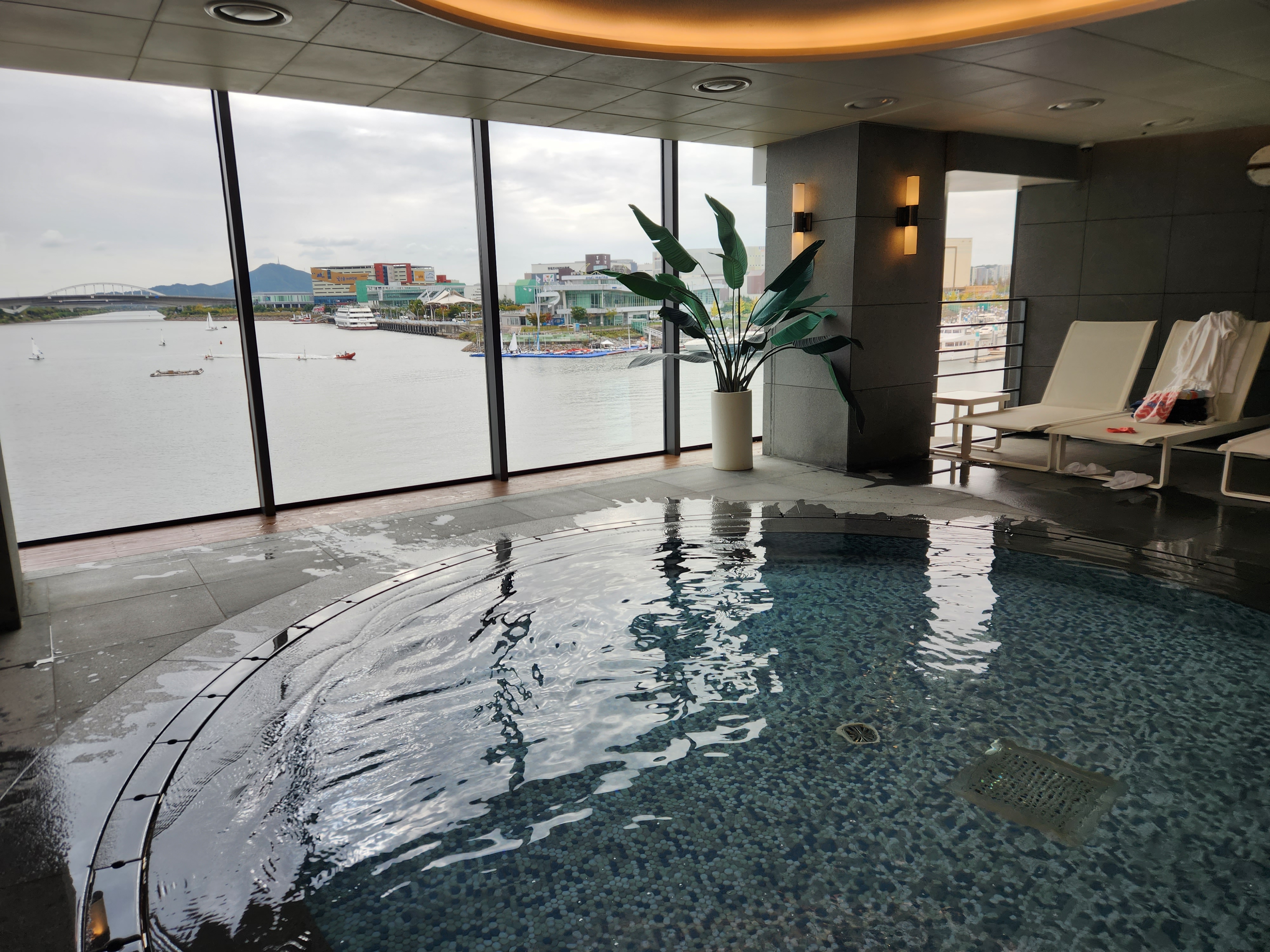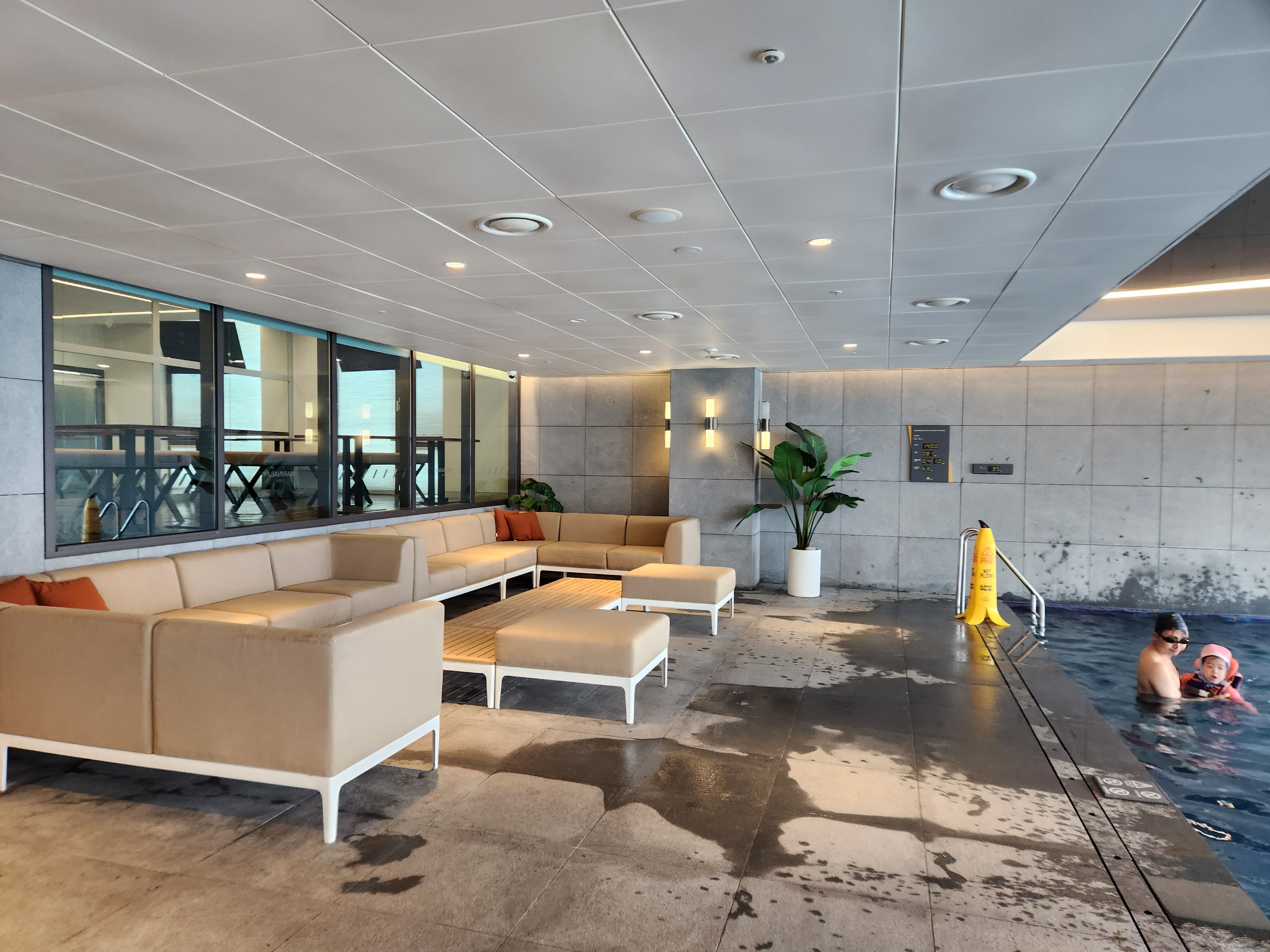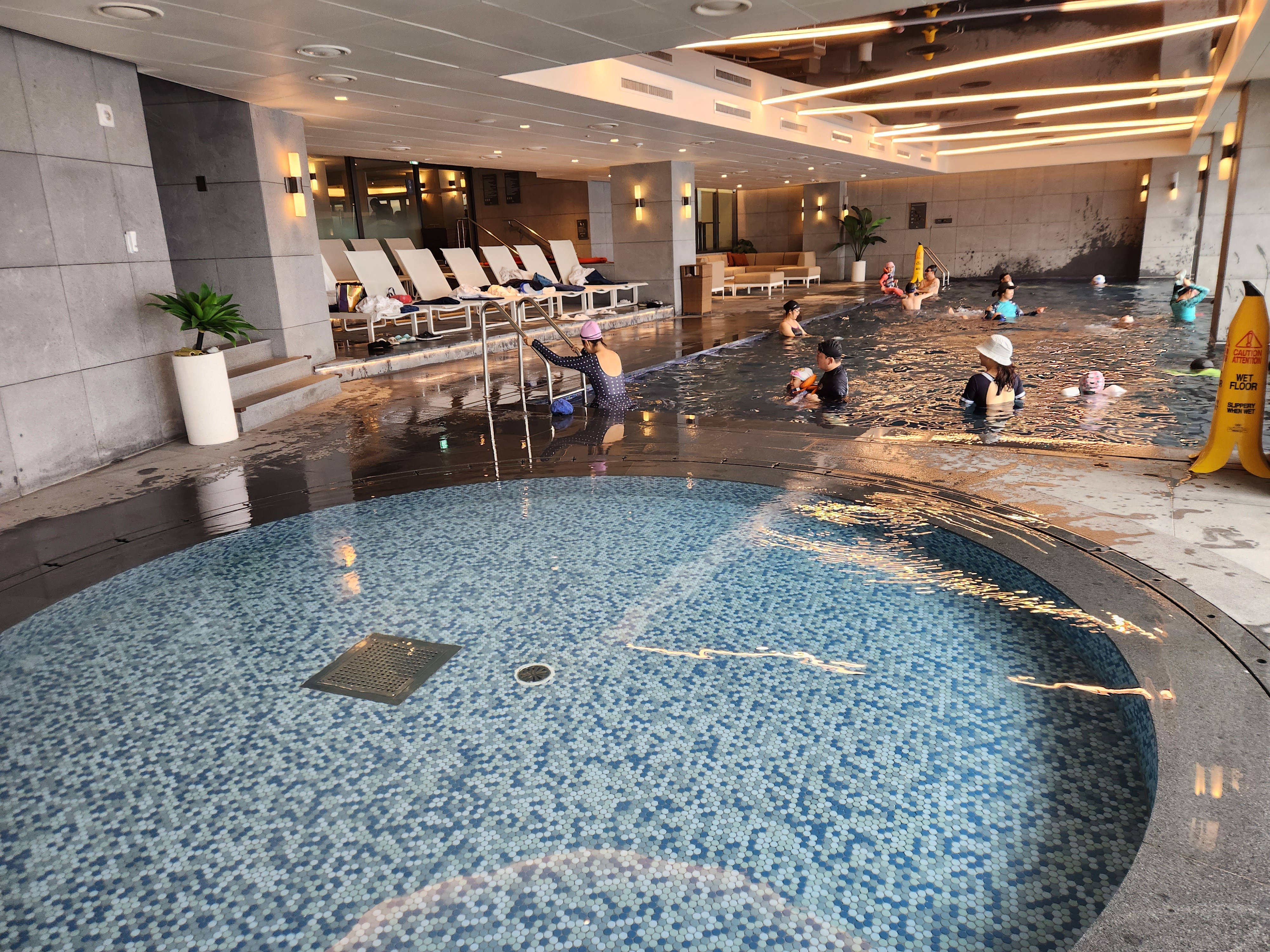 실내 수영장이지만, 전방으로 아라요트장 리버뷰가 탁 트인 인피니티 풀느낌으로 서울 5성 호텔의 실내 수영장보다 작지 않으며, 내부 인테리어와 시설 등은 결코 뒤지지 않게 훌륭합니다. 수온은 35도로 적당하며, 수영장 입장 전, 탈의실과 샤워장 그리고 부스형 사우나까지 실속 있게 갖춰져 있습니다.