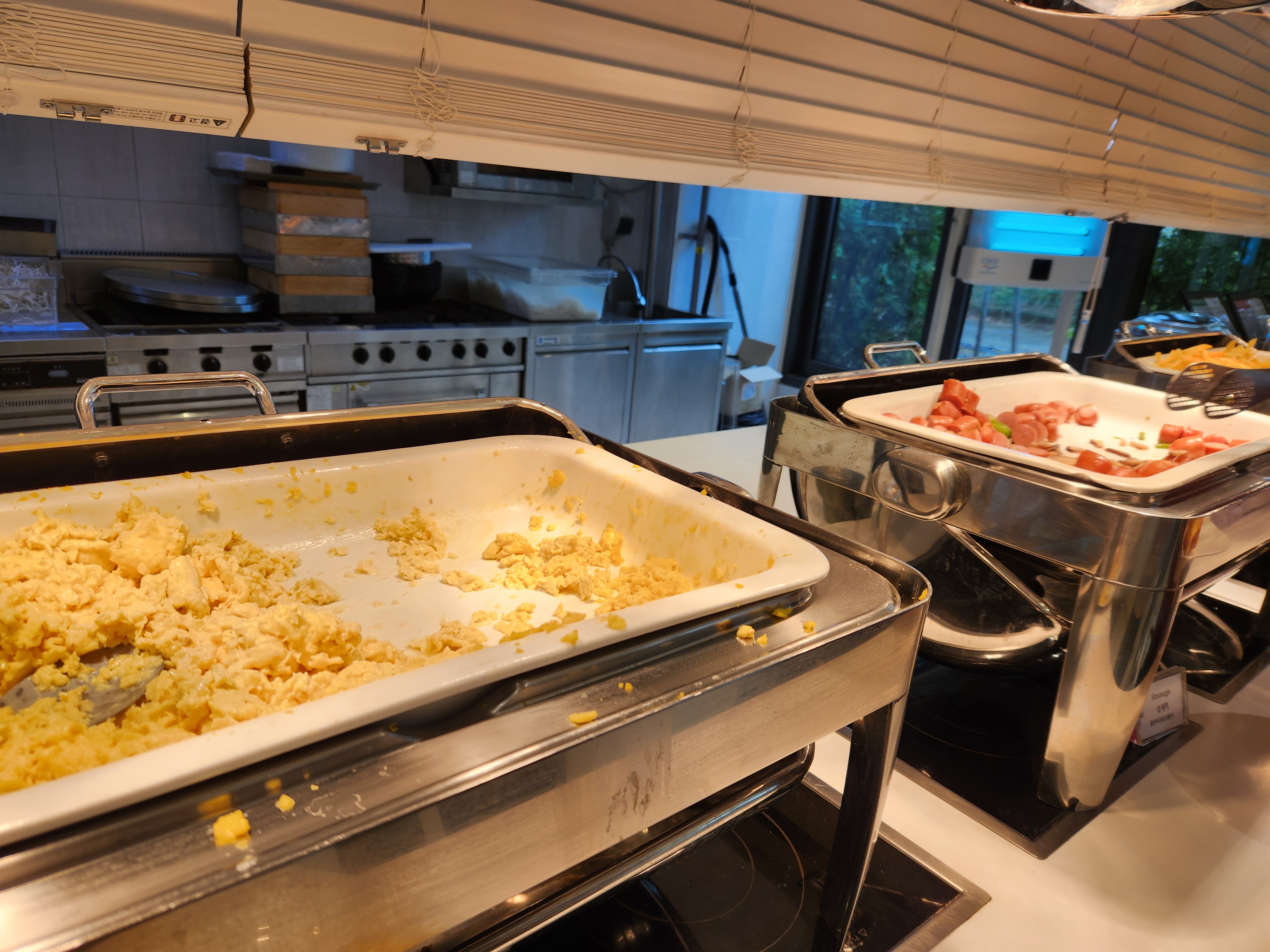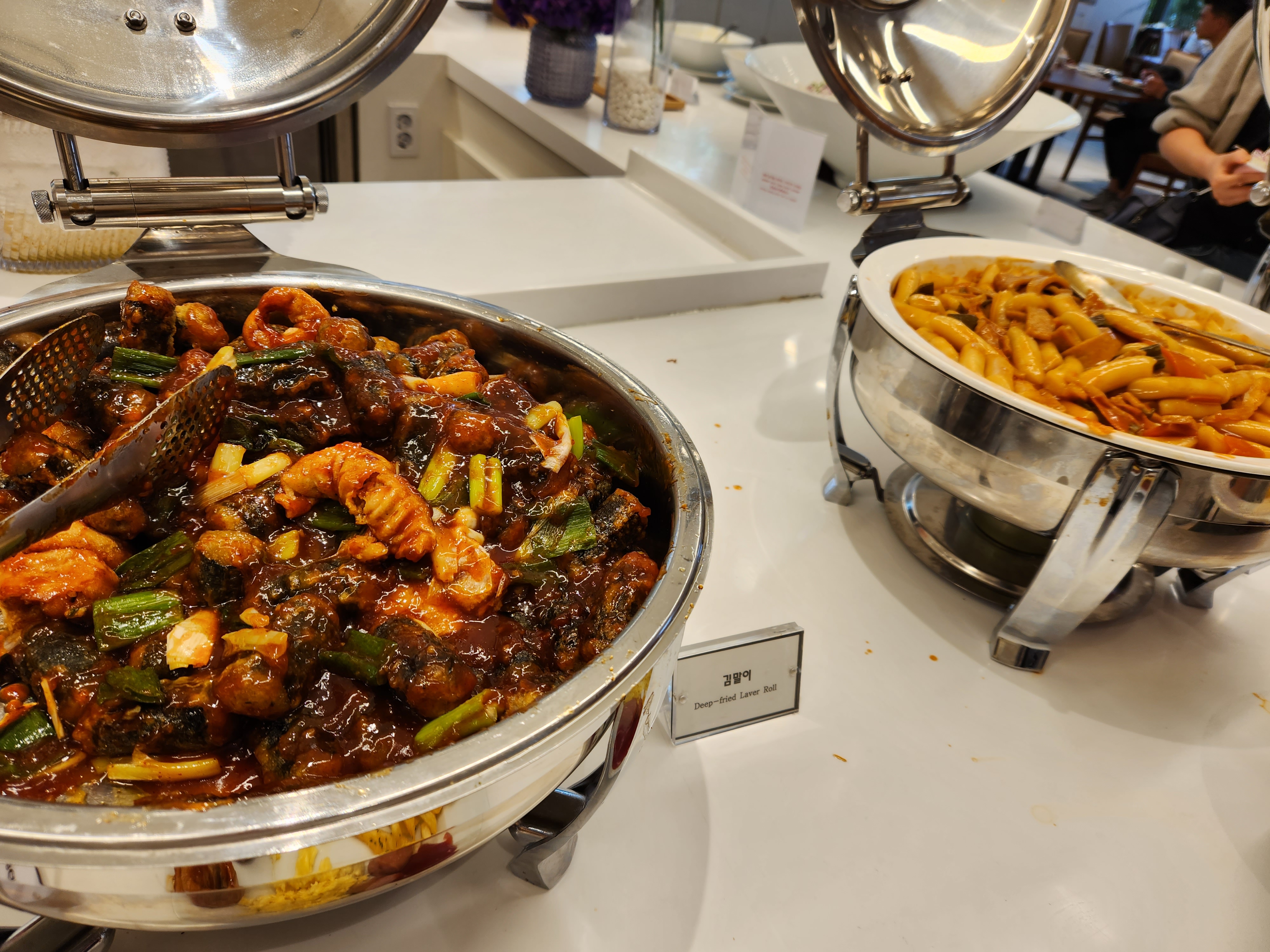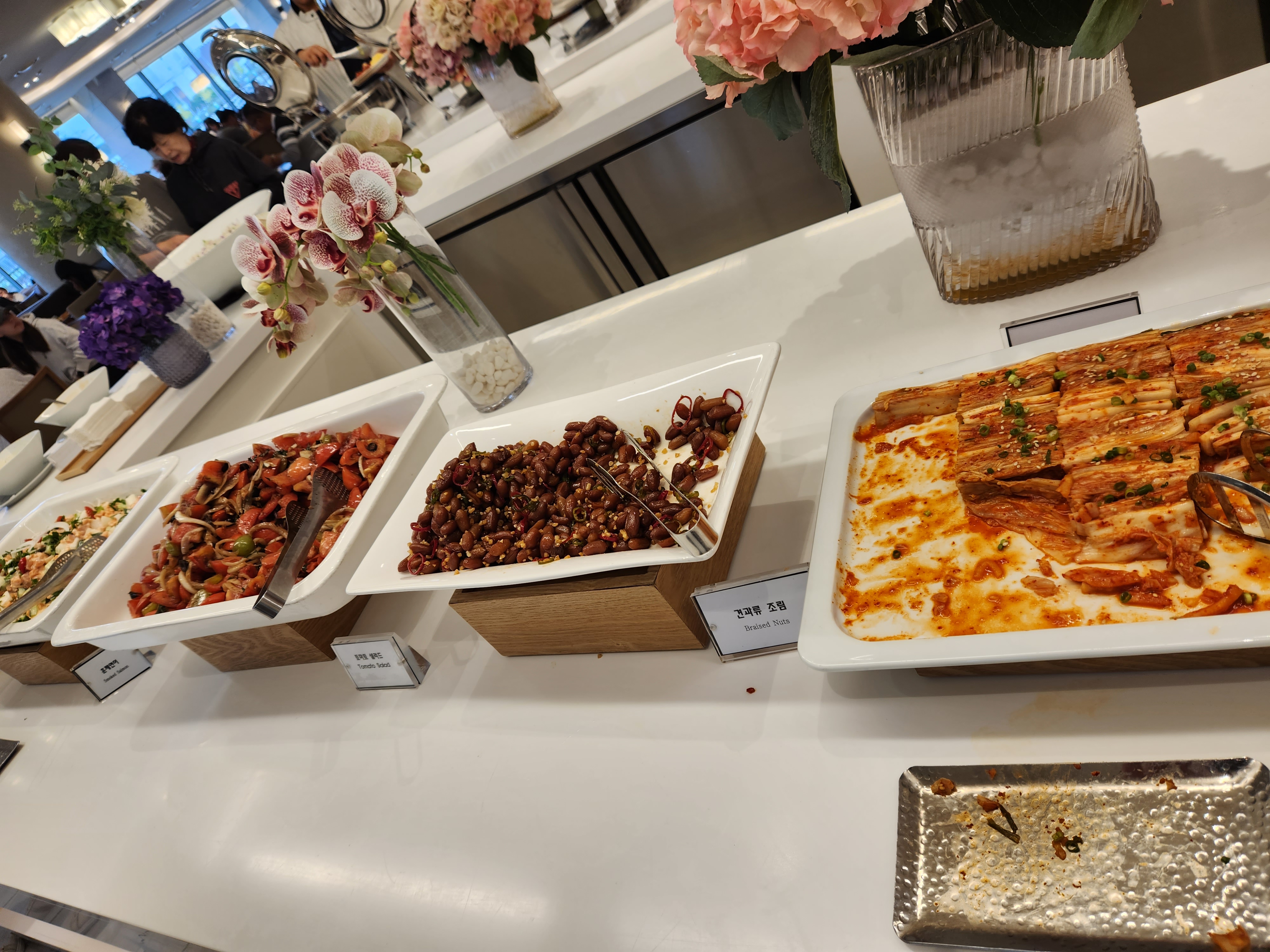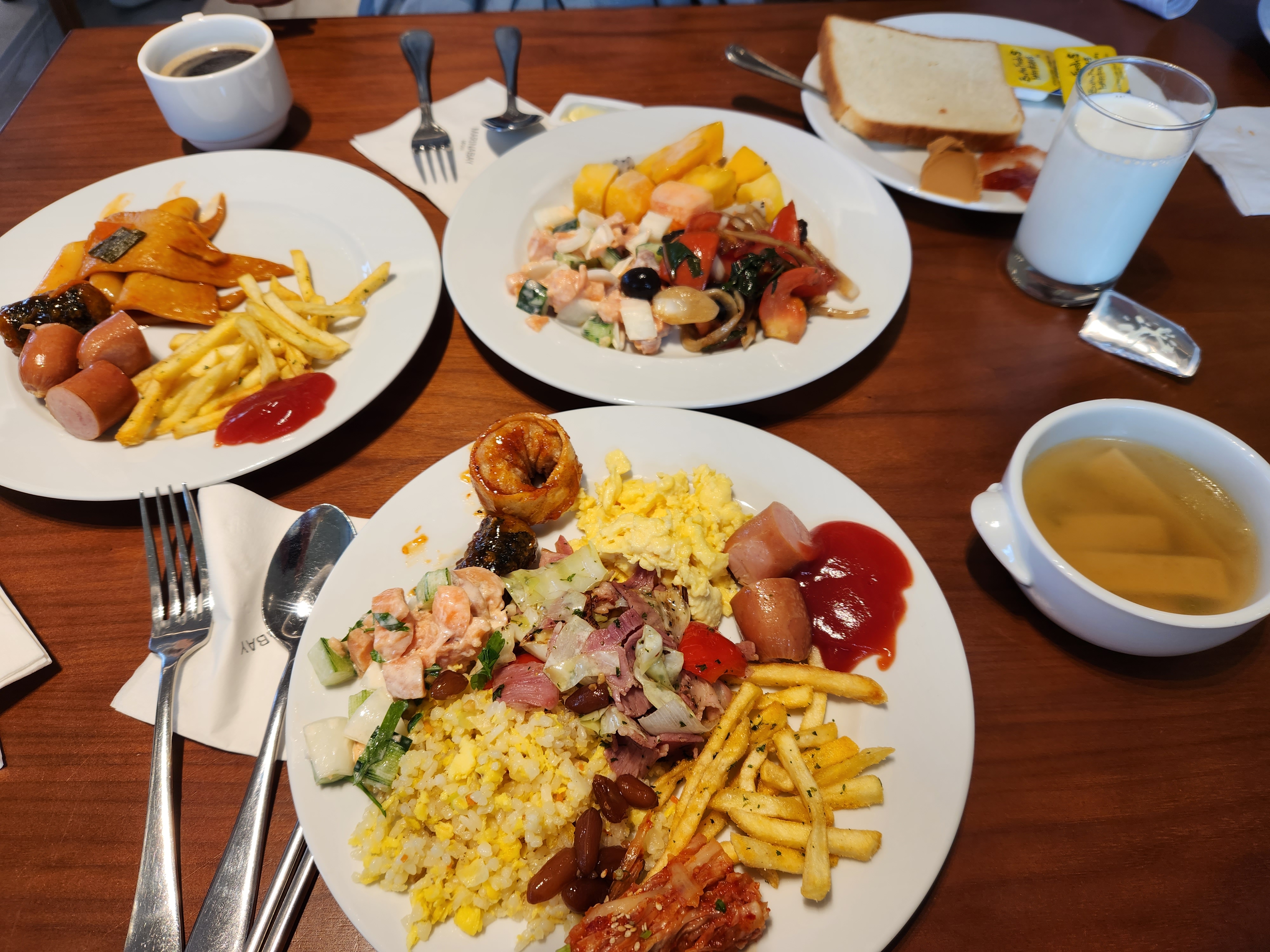 음식은 가짓수 대비 맛 등 준수한 편이었고 먹을만했습니다. 샐러드, 과일, 야채, 한식 찬, 베이컨, 감자, 연어샐러드, 떡볶이, 볶음밥, 소시지, 빵(크로와상, 토스트, 베이글 등), 커피, 주스 등 맛있게 먹었습니다.
