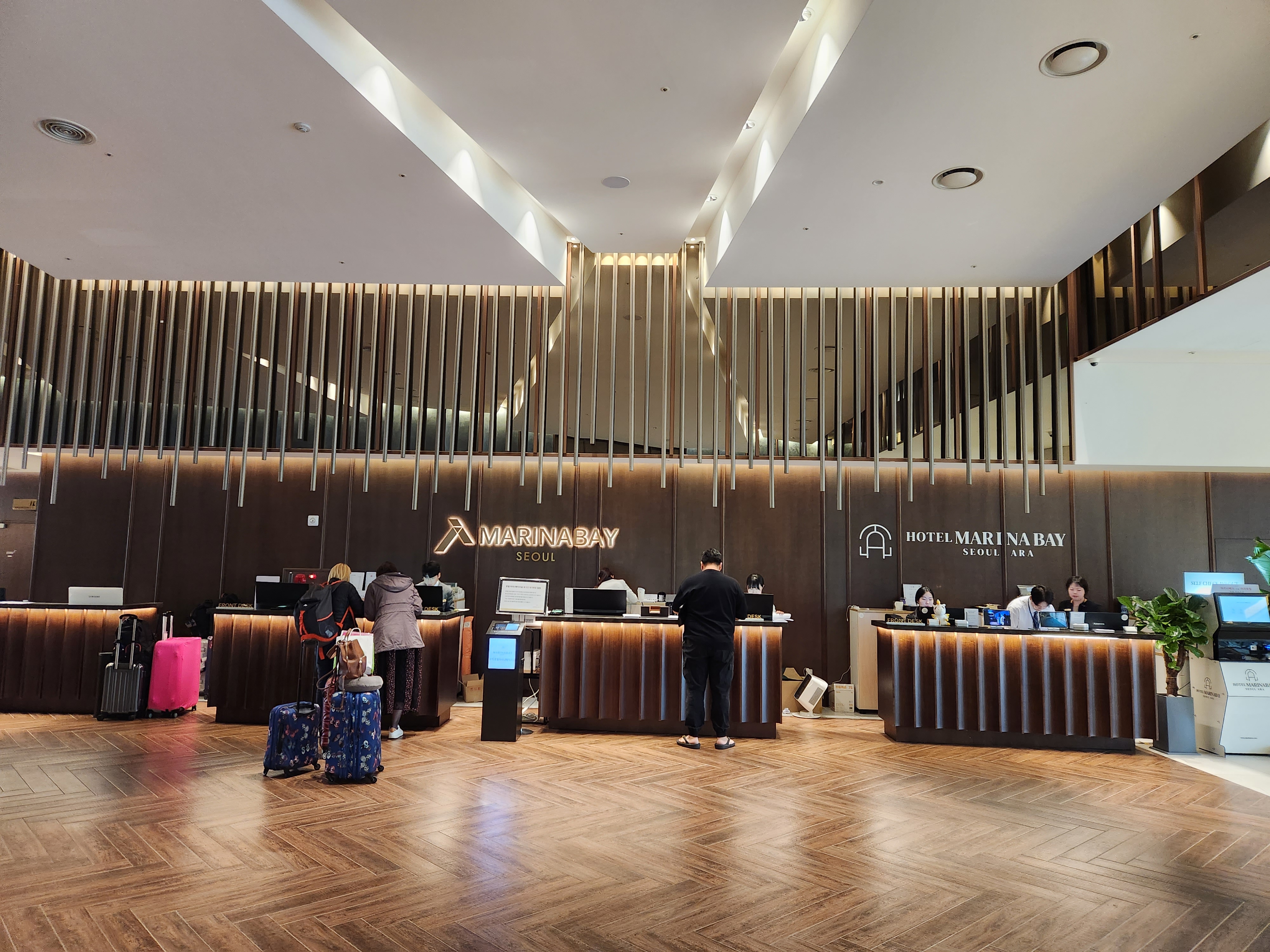 참고로, 로비에 프런트는 마리나베이 서울과 마리나베이 아라 두 개의 데스크가 분리되어 있습니다. 본인의 예약 상황에 따라 구분해서 방문하셔야 합니다. 호텔 객실과 시설물은 분리되어 있지 않고 통합해서 사용을 하나, 분양형 호텔이라 호텔 내부적으로는 아무래도 운영사가 따로 나누어져 있는 듯합니다.
