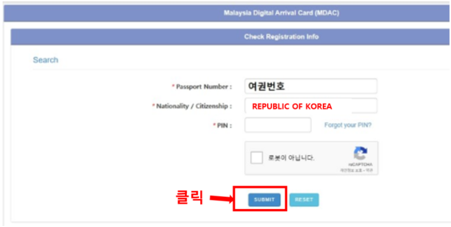 6) 메뉴 상단 CHECK RESISTRATION 클릭하여 여권번호, 국적, 핀번호 기입 후 SUMMIT(제출) 버튼 클릭