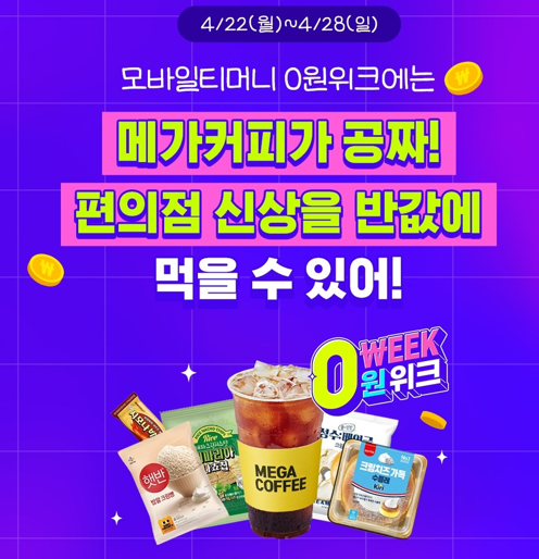 모바일티머니 페이머니(삼성월렛)로 2천원이상 결제 시 무조건, 누구나 100% 2,000 T마일리지로 완급해주는 "모바일티머니 0원위크"가 4월 22일(월) 부터 28일(일) 단 7일간 실시됩니다. 커피를 무료로 또는 1+1으로 편의점 신상을 반값으로 구매할 수 있는 기회이니, 잊지말고 혜택을 받으시기 바랍니다.