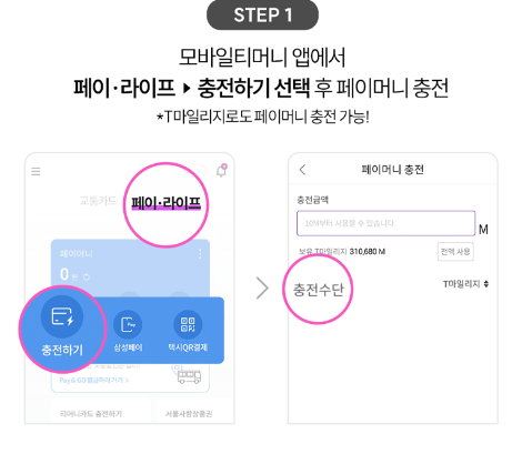 1) 모바일티머니 앱 다운받고 페이.라이프 => 충전하기 선택 후 페이머니 충전(*T마일리지로도 페이머니 충전가능)