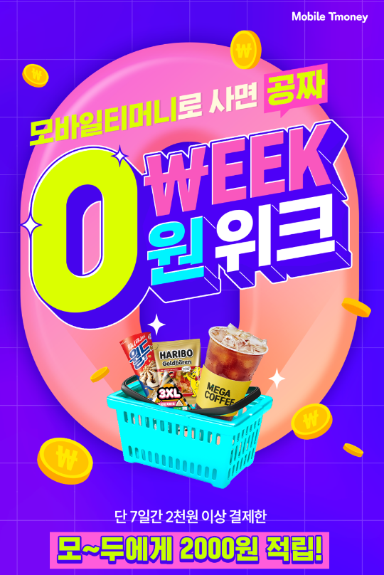 모바일티머니 페이머니(삼성월렛)로 2천원이상 결제 시 무조건, 누구나 100% 2,000 T마일리지로 완급해주는 "모바일티머니 0원위크"가 4월 22일(월) 부터 28일(일) 단 7일간 실시됩니다. 커피를 무료로 또는 1+1으로 편의점 신상을 반값으로 구매할 수 있는 기회이니, 잊지말고 혜택을 받으시기 바랍니다.