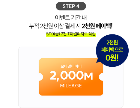 4) 이벤트 기간 내 누적 2천원 이상 결제 시 2천원 페이백(5/10(금) 2천 T마일리지로 적립)