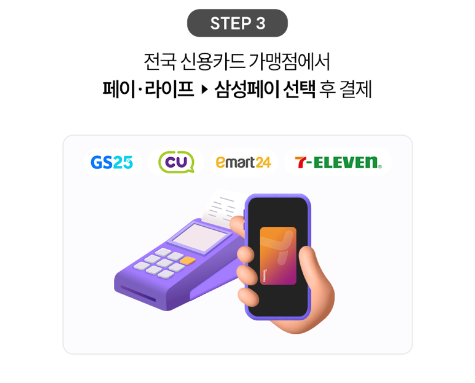 3) 전국 신용카드 가맹점에서 페이.라이프 => 삼성페이 선택 후 결제