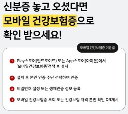 만약 신분증을 두고 왔을 때는 전액 본인 부담으로 진료를 받아야 하여, 다만, 14일 이내 신분증과 영수증을 들고 다시 병원 등에 방문하면 건강보험 혜택만큼을 환급 받을 수 있습니다.