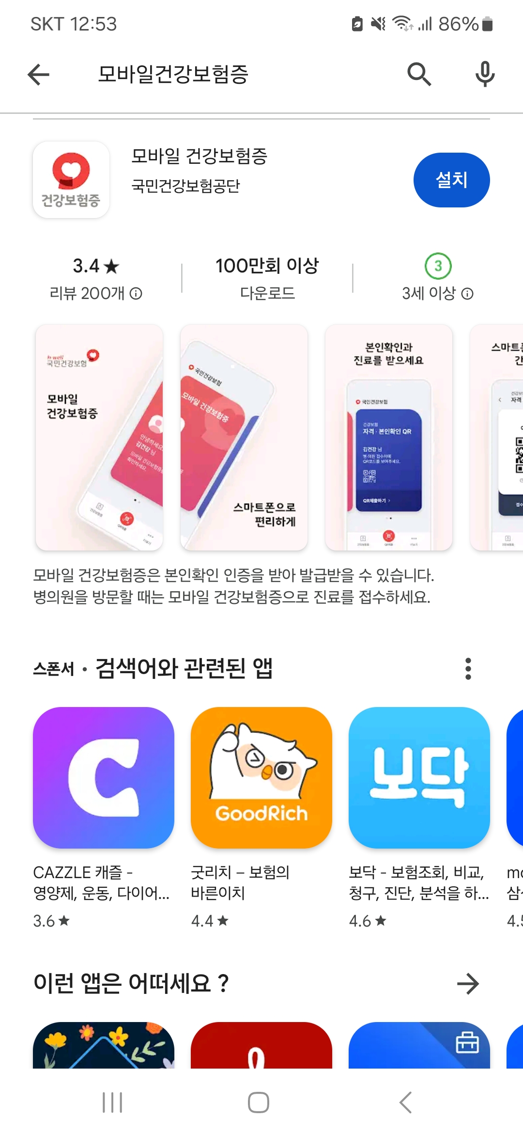1) 모바일 건강보험증 앱을 다운받아 설치합니다.