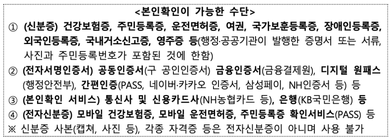 건강보험증, 주민등록증, 운전면허증, 여권, 국가보훈등록증, 장애인등록증, 외국인등록증, 국내거소신고증, 공공기관이 발행한 증명서/서류 등
