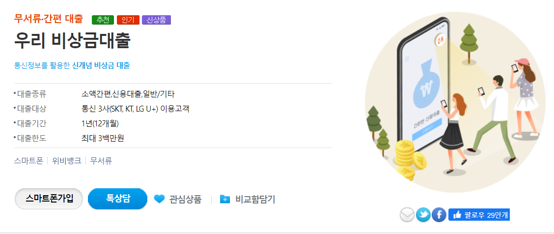 우리은행에서 출시된 우리 비상금대출을 추천드립니다. 우리 비상금 대출은 최대한도는 300만원이고 금리는 4%대이며, 단, 대출금리는 시장과 개인의 신용에 따라 바뀔 수 있습니다. 무방문, 무서류 인터넷 상품입니다. 무엇보다도 통신정보를 활용한 신개념 비상금 대출이라 매력적입니다.
