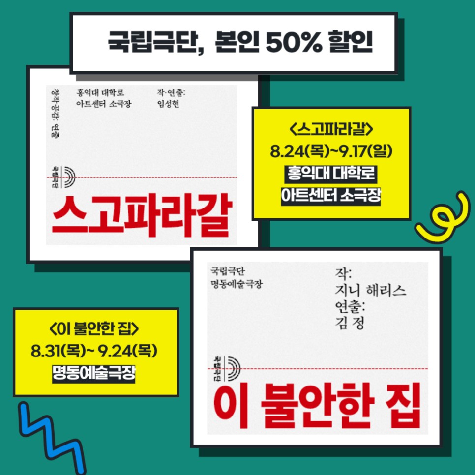 문화체육관광부가 국립극단, 국립중앙극장 등 11개 국립예술기관과 협력해 통합문화이용권(이하 문화누리카드) 이용자에게 하반기 공연 관람권을 할인해 제공한다고 합니다.