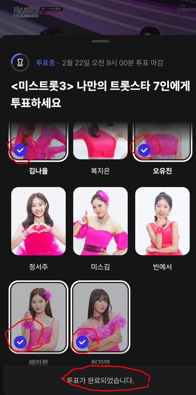 4)나열된 투표대상 가수 중 응원하는 7인의 가수를 선택합니다.