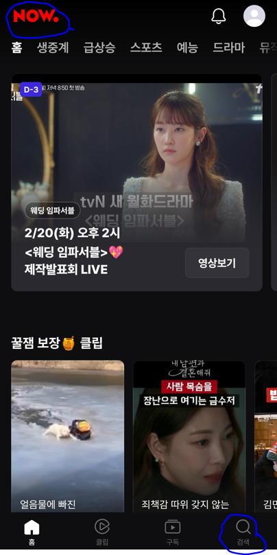 1)네이버 NOW 앱 설치 후 첫 화면 좌측 상단에 빨간색 NOW , 우측 하단에 검색을 누릅니다.