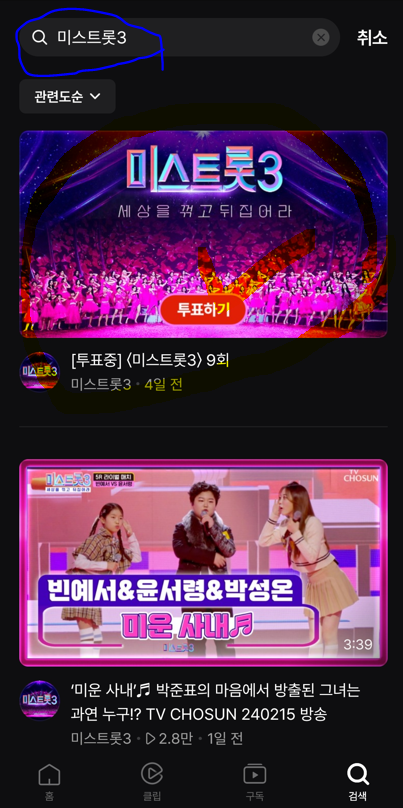 2) 앱 실행 후 검색창에 '미스트롯3' 검색