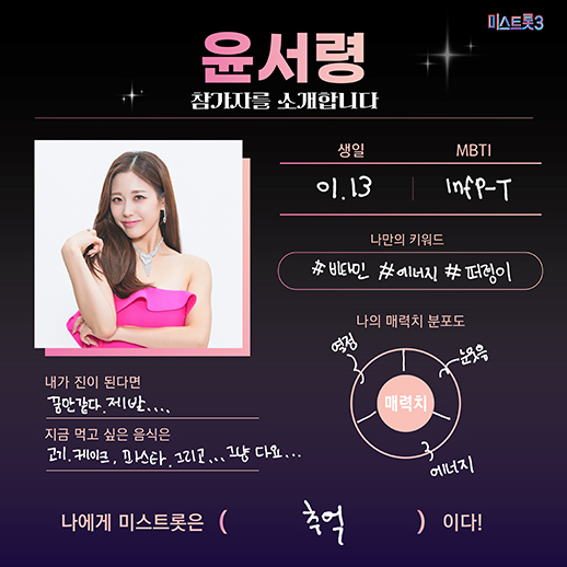 2020년 MBC편애중계 10대 트로트 가수왕 대전 준우승. KBS 전국 트롯체전 출연했었습니다. 2003년생으로 올해 성인 이되어 발랄하고 가창력까지 그동안의 실력 향상이 더욱 기대가 되는 가수입니다.