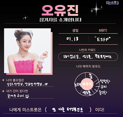 2021년 KBS 트롯 전국체전 동메달을 수상한 트로트 신동 출신으로 현재 트롯샛별로 활동하고 있는 유망주입니다.