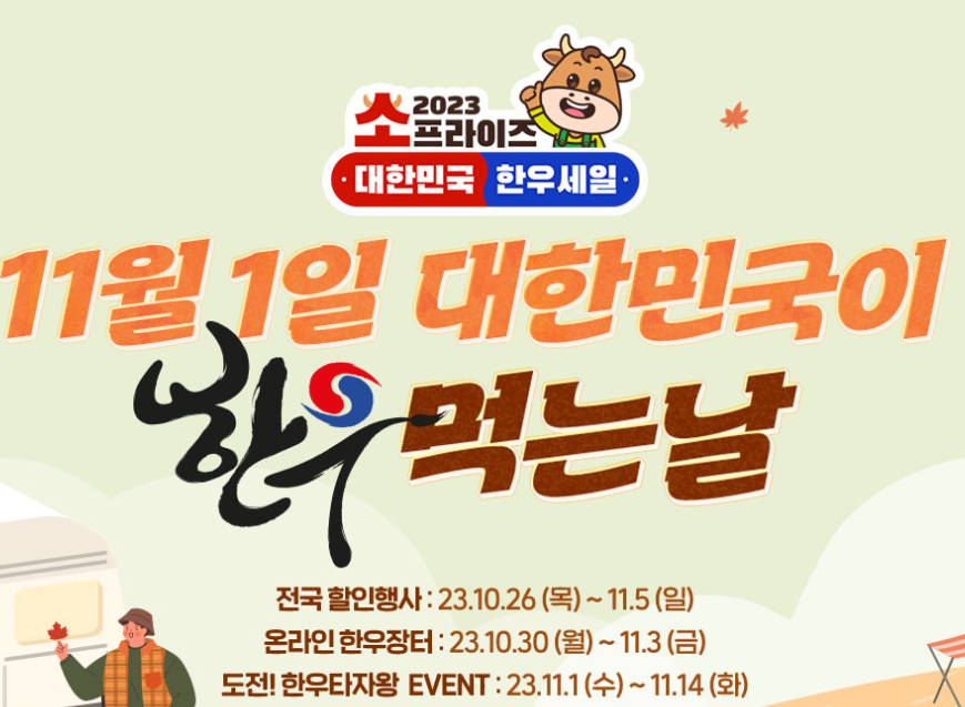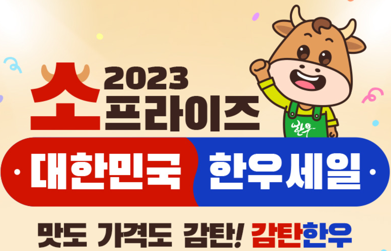 4. 농림축산식품부는 이날부터 다음 달 5일까지 전국 농축협 하나로마트, 민간 온오프라인 매장에서 '소프라이즈 2023 대한민국 한우세일' 행사를 진행합니다.