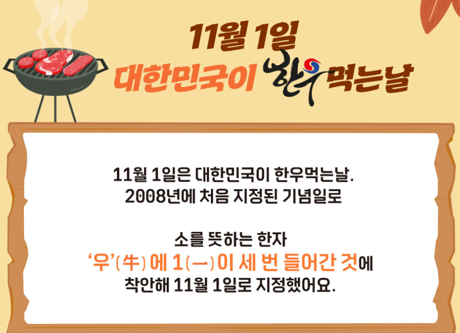 최근 갑작스런 가축전염병인 '럼피스킨병' 확산 여파로 한웃값이 오르고 있는 가운데도 한우자조금관리위원회 주최로 대형마트들은 한우데이(11월1일)를 맞아 앞다퉈 '반값 판매'를 시작하였습니다. 10월26일 부터 최장11월5일까지 전국 대형마트, 온라인몰, 농.축협 하나로마트, 기타 매장 등에서 전국적으로 반값 한우 세일이 진행이되며, 사전 확보된 물량이 한정되어 있기에 할인판매행사 매장 확인 후 빠르게 구매하시는 것을 추천드립니다.