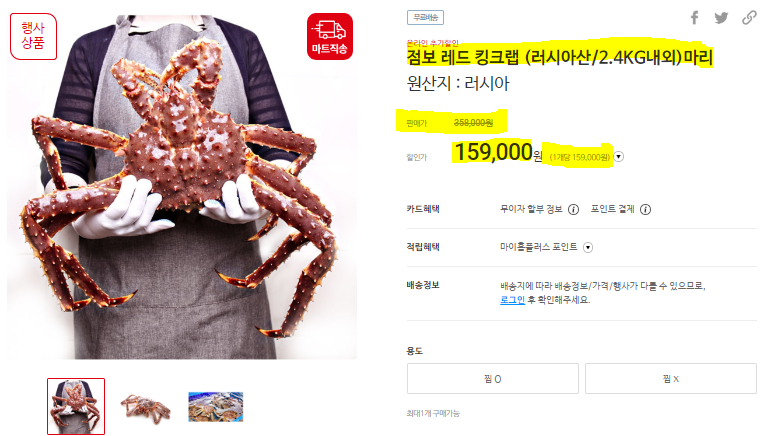 요즘 러시아산 킹크랩의 반값 소식으로 많은 분들이 대형마트 행사에서 구매에 열기를 올리고 계신다고 합니다. 온라인 구매나 대형마트 행사 구매 시 찜 서비스가 없어 식당에서 파는 것처럼