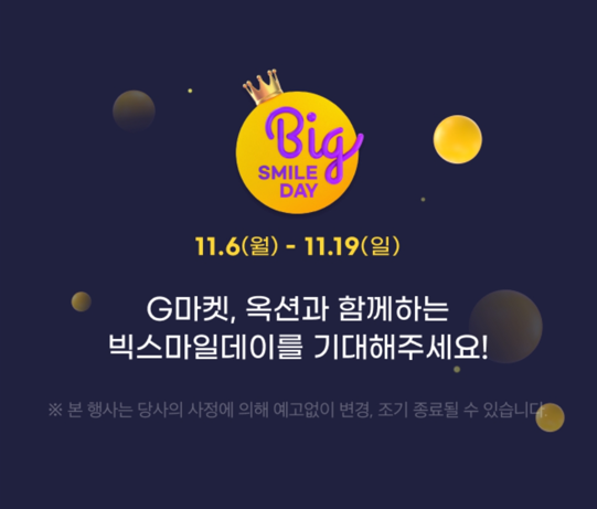 G마켓과 옥션은 11월 6일 00시(자정)부터 19일까지 2주간 연중 최대 쇼핑 축제 ‘빅스마일데이’를 열고, 카테고리 별 인기 상품을 최대 80% 할인가 판매에 나섭니다. 역대급 무제한 할인쿠폰과 매일 카테고리 별로 최저가 상품으로 온·오프라인을 아우르는 역대 최대 규모의 행사가 진행이 되니, 쇼핑의 계절에 최대 가성비로 득템 하시길 바랍니다.